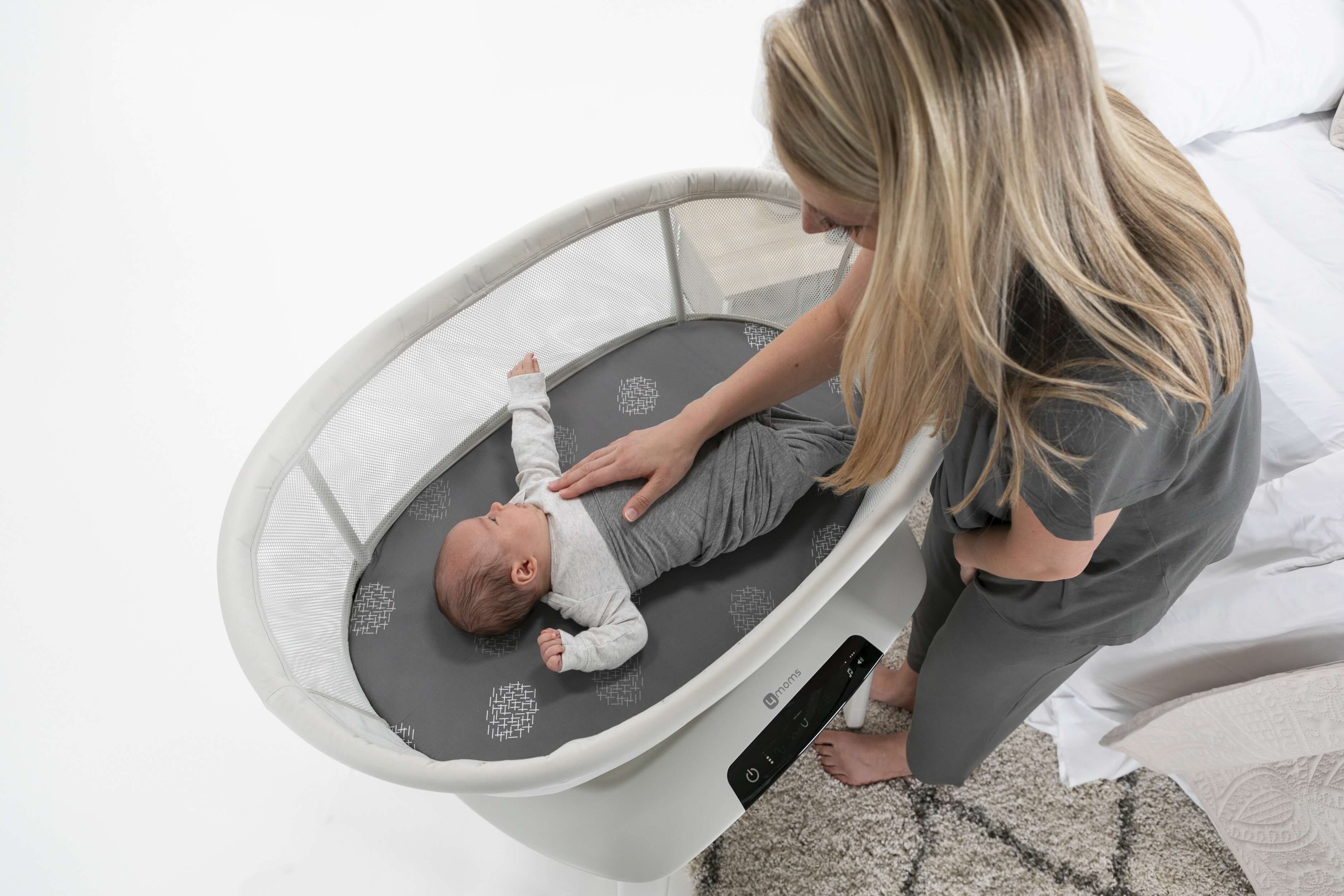 The 4moms® mamaRoo sleep™ bassinet uses the same proven motions of the 4moms mamaRoo® infant seat to help your baby fall asleep and stay asleep longer. Soothe and comfort baby in the 4moms mamaRoo sleep bassinet with its natural bounce and sway motions that move just like parents do. It features 5 unique motions (car ride, wave, kangaroo, tree swing and rock-a-bye), vibration and 5 speed options to find the perfect combination baby loves. You can also play one of the 4 white noise options (rain, ocean, fan and shh). Easily control all features via the 4moms app on a compatible smart device. The 4moms app also features a timer that can be used to help establish a bedtime routine and improve sleep.