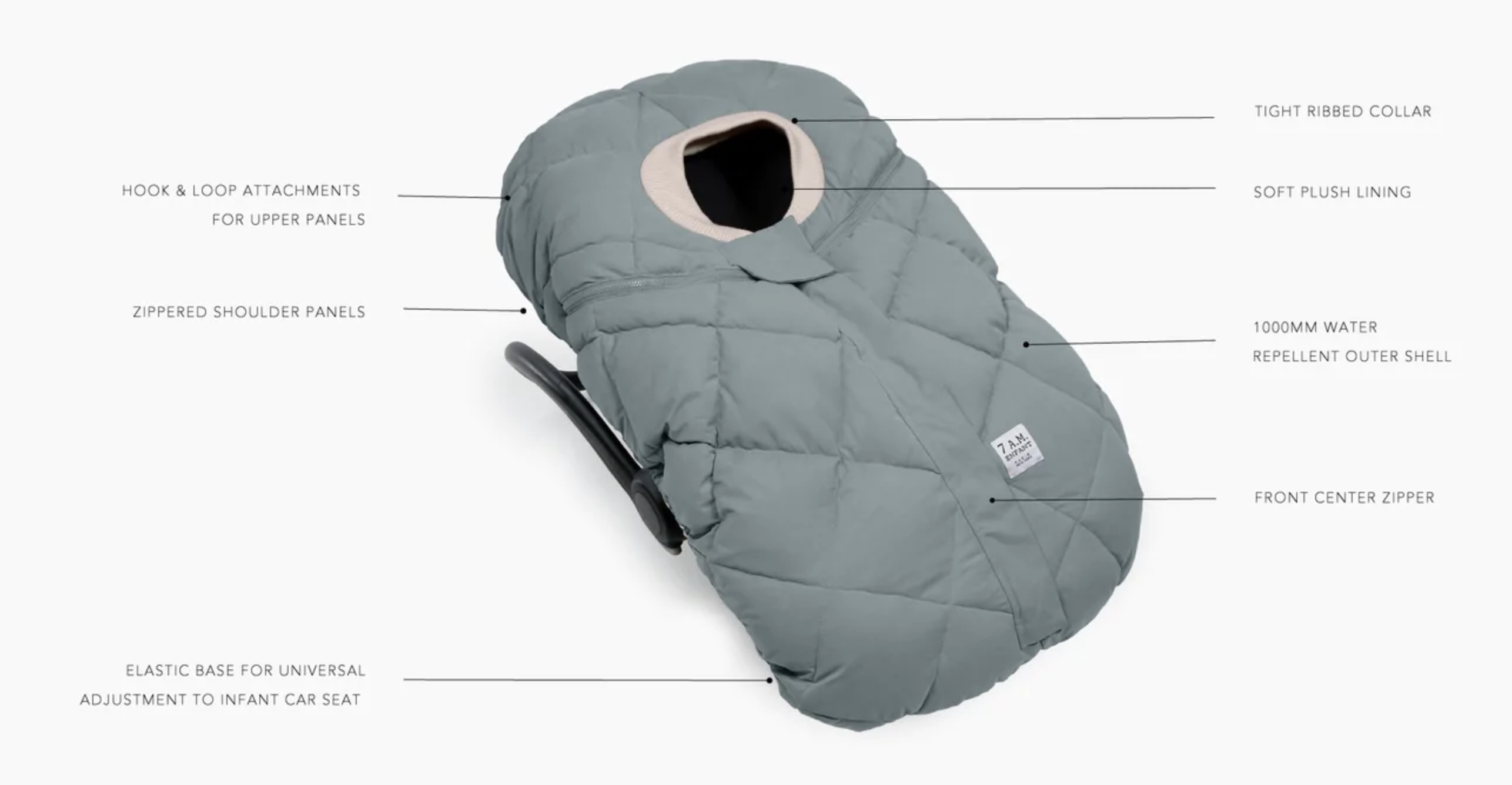 - Horizontal shoulder zippers for uncovering baby’s head