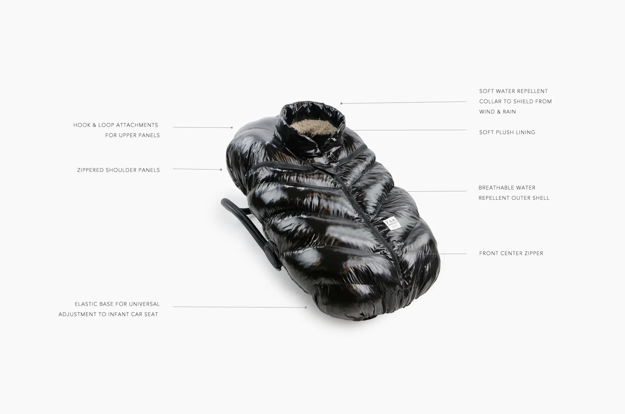- Horizontal shoulder zippers for uncovering baby’s head