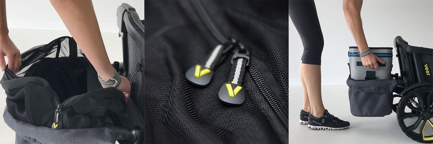 Veer Basket Designed to add even more cargo space to the Cruiser, our lightweight aluminum, and soft-sided storage basket mounts solidly into the Cruiser”s two anchor points behind the rear seat. It folds for easy transport or storage without removal. The soft-sided construction is removable and machine washable. A mesh zipper hood either discreetly rests on the bottom of the basket or doubles its capacity by covering clothes and other bulky items. Drink and Snack Tray and Napper both fit comfortably in this accessory.
