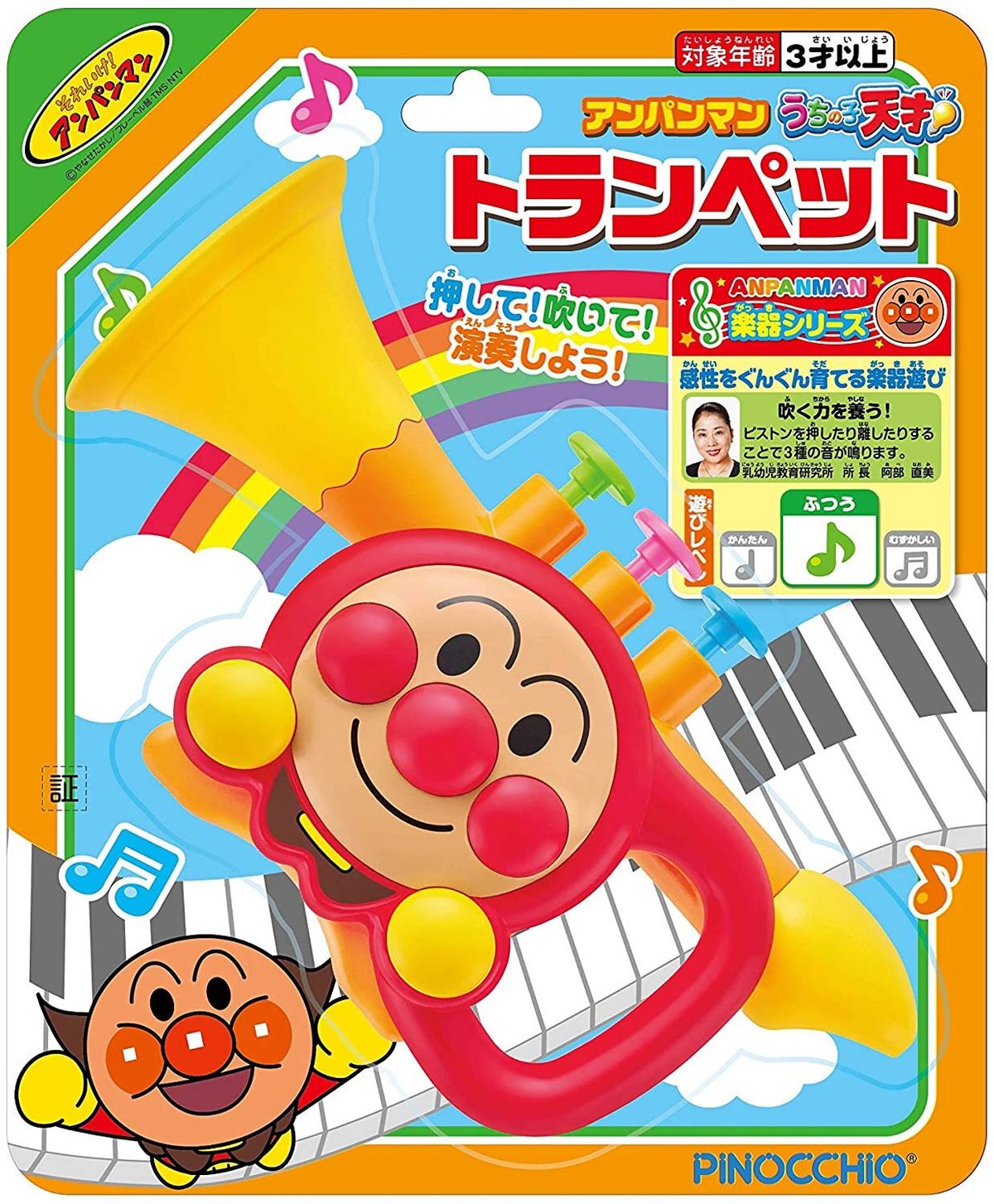 A cute and colorful Anpanman trumpet designed especially for little hands! Part of the popular “My Little Genius Instrument Series”, this toy encourages children to explore music in a fun and interactive way.