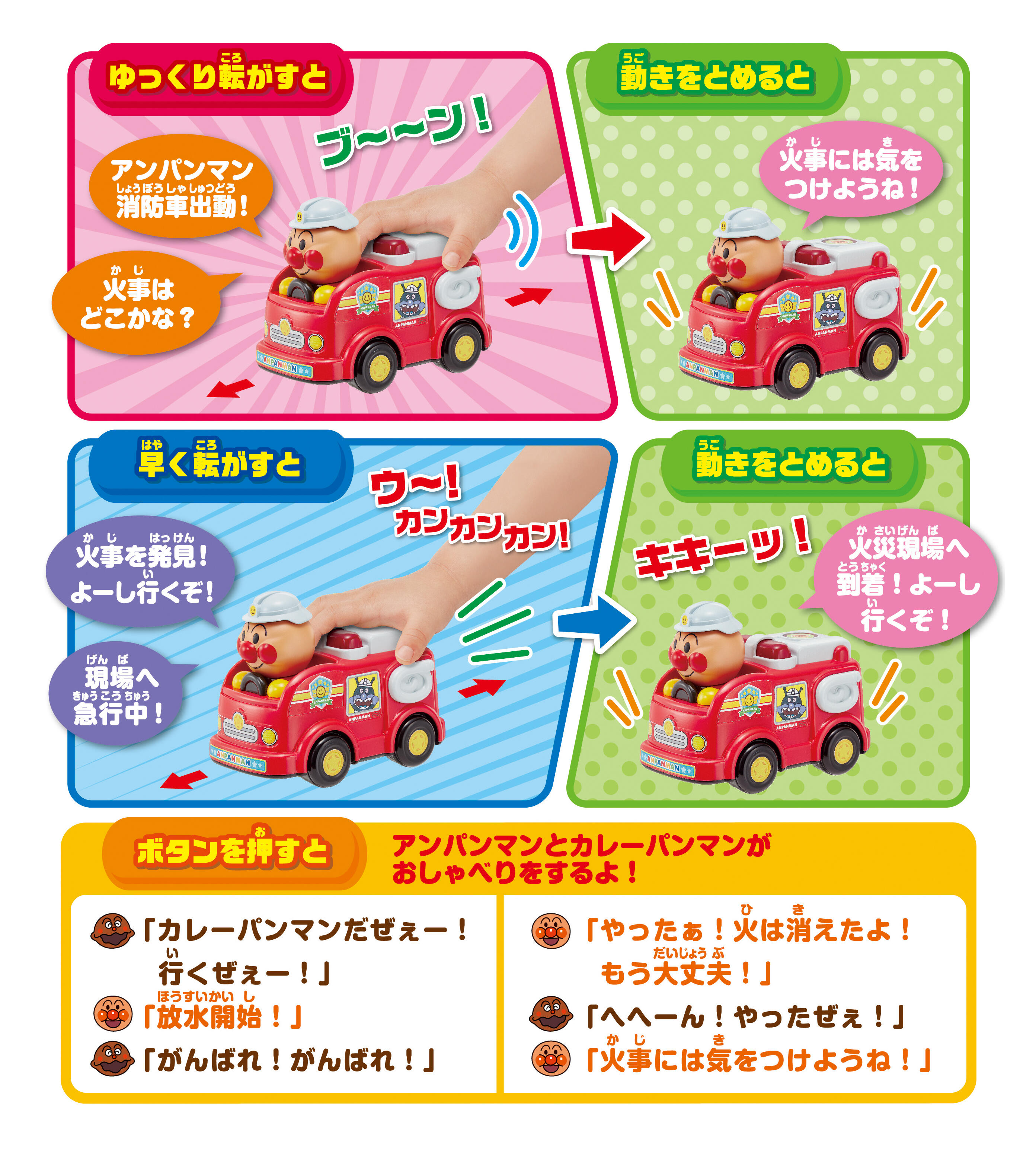 Sound the alarm — Anpanman’s Talking Fire Engine is ready for action! This adorable interactive vehicle from the Anpanman Working Vehicle Series lets little heroes join Anpanman and Currypanman on exciting rescue missions.