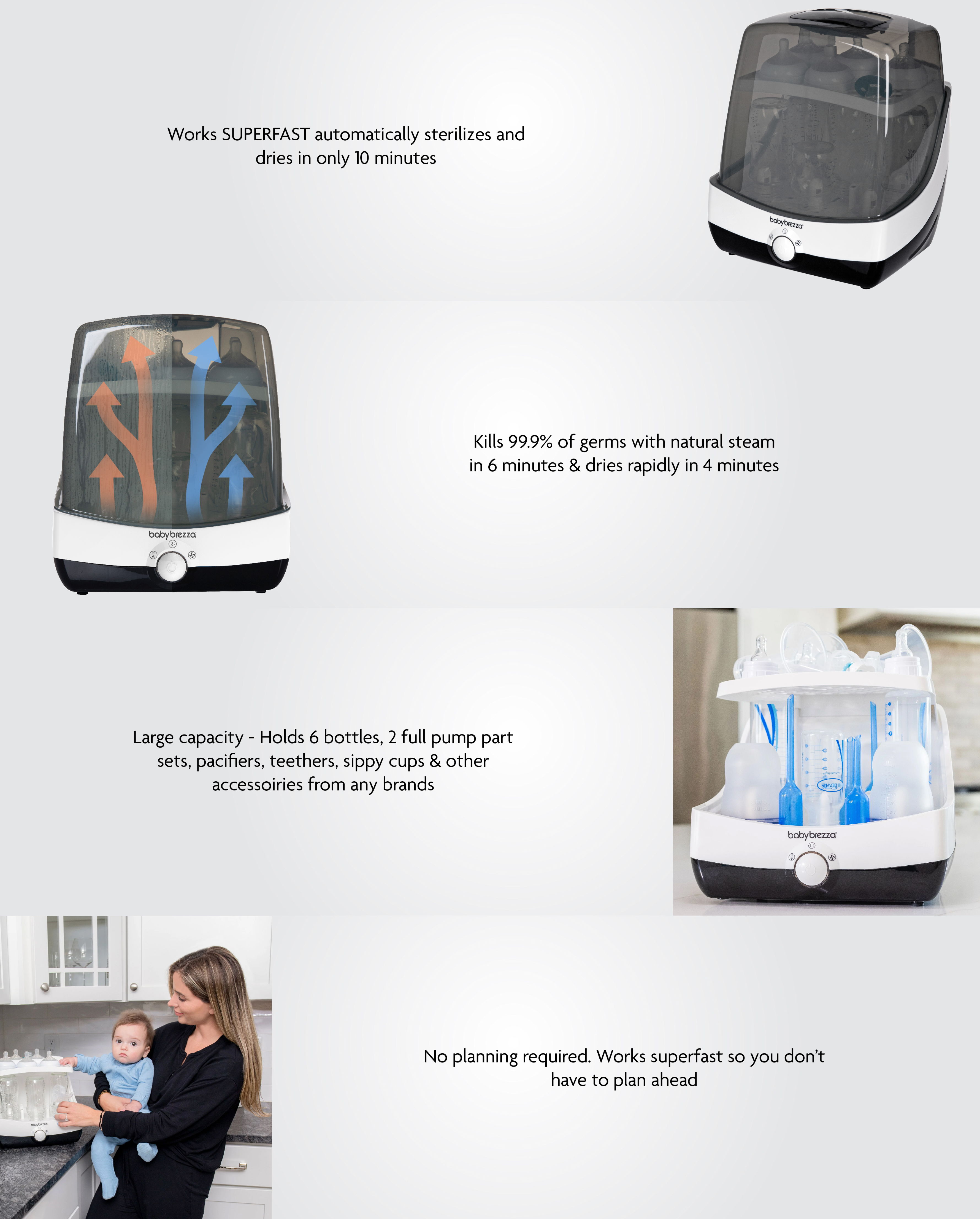 - Fastest Sterilizer Dryer: Takes only 10 minutes to sterilize & dry your baby products from start to finish – 75% faster than other sterilizer dryers! It works so fast that you don’t have to pre-plan when you’re going to sterilize your bottles or baby product parts.