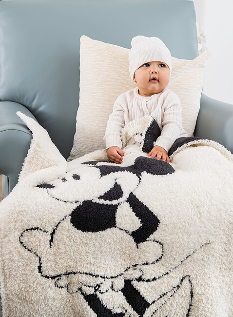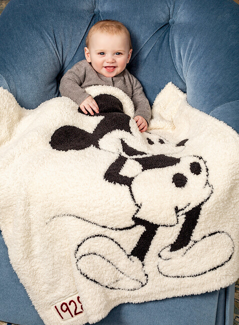 Dreams really do come true when your little one gets cozy with our custom Cozychic Classic Baby Blanket featuring Disney Minnie Mouse. The adorable outlined drawing of Minnie Mouse features a hi-lo knitting technique with our world-renowned feather yarns, creating a unique dimension and lofty thickness while making it reversible. A deep red, hand embroidered 1928 is stitched on a washed canvas patch, detailing the year of Mickey Mouse’s first appearance. Measures 30” x 32”. Machine washable, tumble dry low.