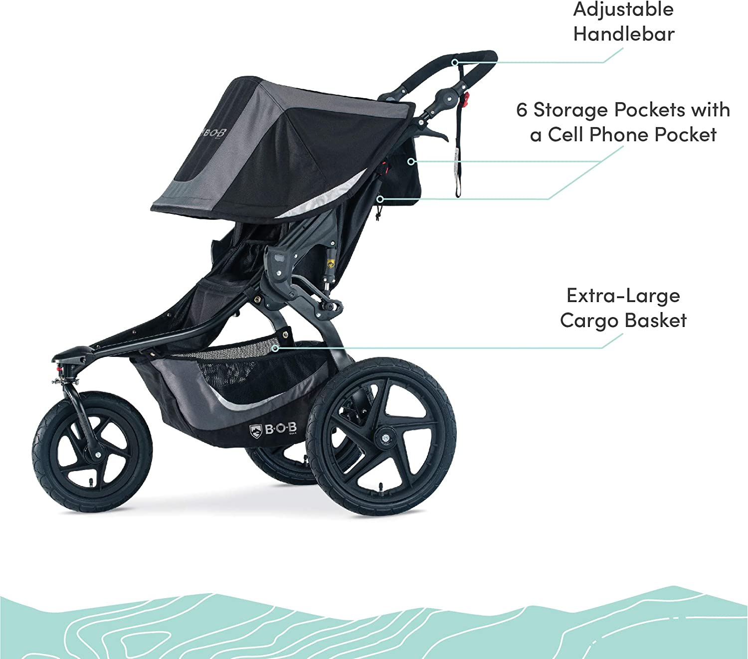With the BOB Gear Revolution Flex 3.0, you can say yes to any type of family outing-whether prepping for a 10K or heading out for a day at the zoo. Mountain-bike style suspension keeps you running smoothly on any terrain and the adjustable handlebar fits parents of all heights. Inspired by kayaks, the seat is designed with compression padding for all-day comfort and sits fully-upright so your little rider can take in the world. The extra-large UPF 50+ canopy shields from the elements and includes a magnetic "peek & chat" window so you can check on and chat with your child along the way. With a spacious cargo basket and six storage pockets, you'll have plenty of room for all your gear and can keep your cell phone close-at-hand. The swivel-locking front wheel maneuvers easily through crowded streets and locks for stability when jogging while the reflective accents keep you safe on all your journeys.
