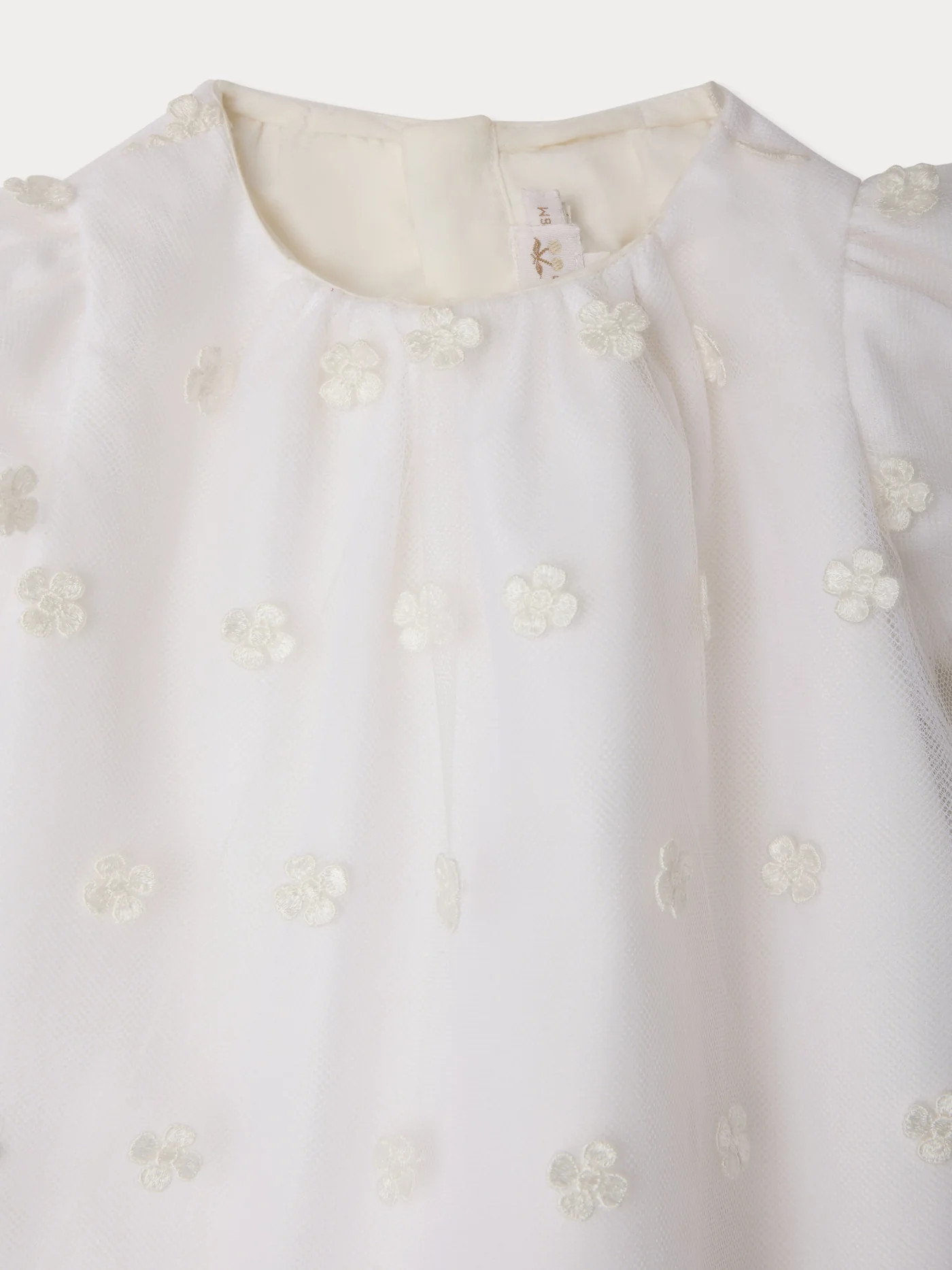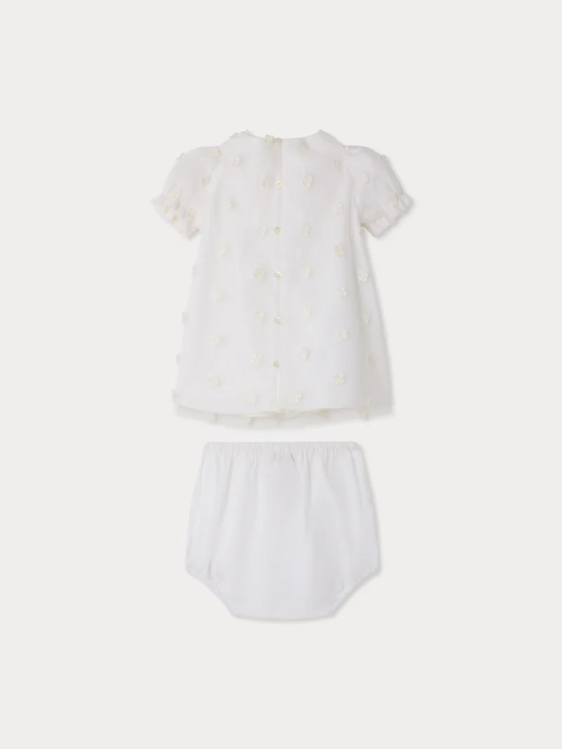 This Lelisa babies' dress is a delicate and refined piece, perfect for special events and occasions. It's made of lightweight tulle decorated with embroidered flowers for a romantic, elegant look. The dress is lined in cotton poplin for added comfort and a soft feel on baby's skin. It comes with matching poplin bloomers for a comfortable and practical design.