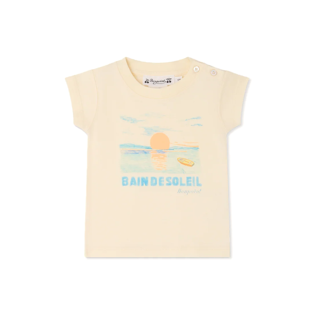 This Tom babies' T-shirt features a sunbathing print that makes it perfect for vacations. It is made of organic cotton and has buttons at the shoulder for easy dressing.