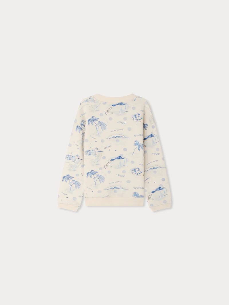 The Tonino sweatshirt features a charming travel-inspired print, finished with solid-color ribbed cuffs and hem. This undyed fleece design is very comfortable to wear.