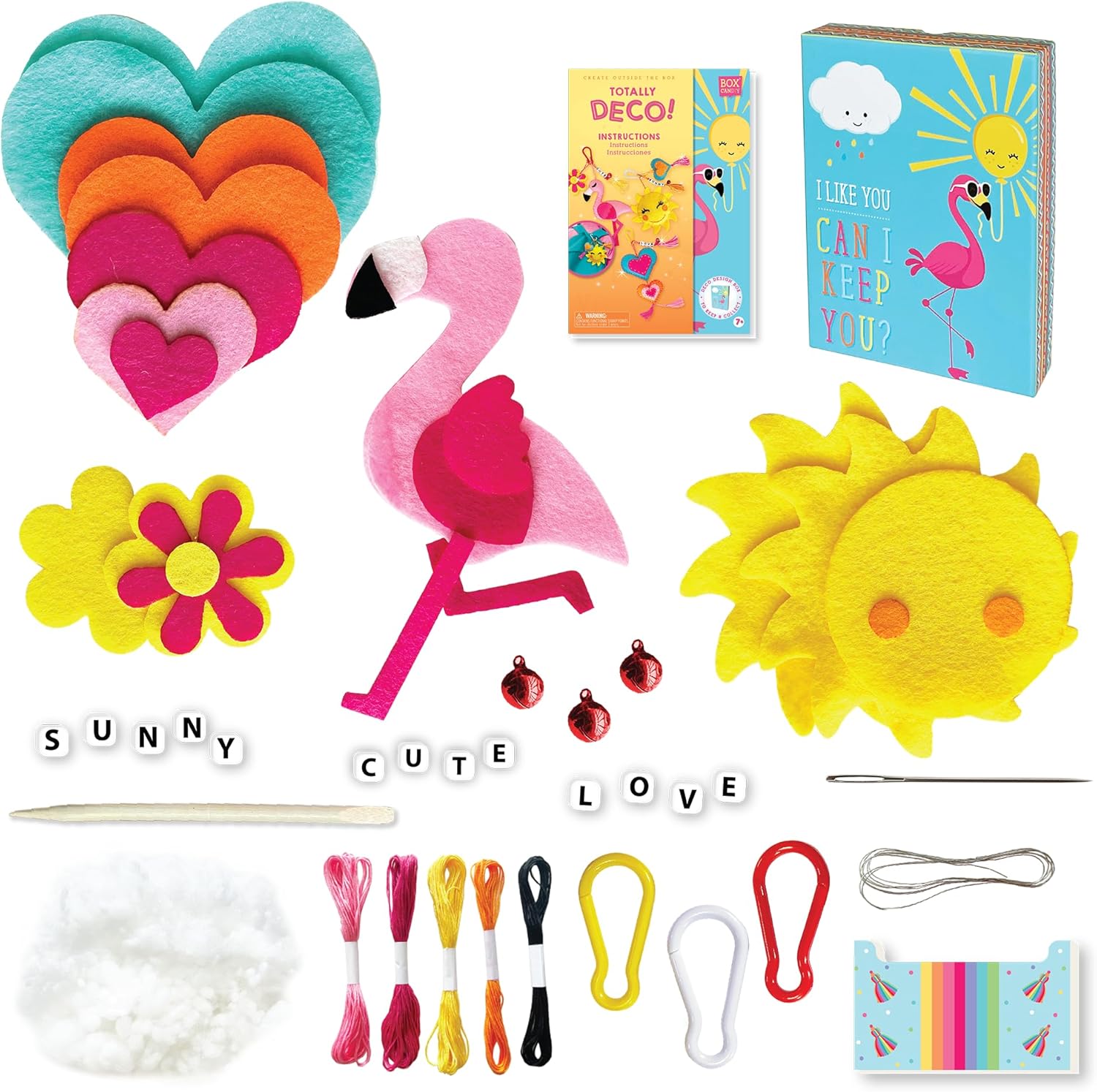 Outfit a backpack, purse, lunchbox or suitcase in your own personal style creating colorful hanging charms! Make a cheery sunshine charm, a double hearts charm and a flamingo charm using simple sewing. Add decorative beads and tassels, attach the carabiners and they’re ready to hang!