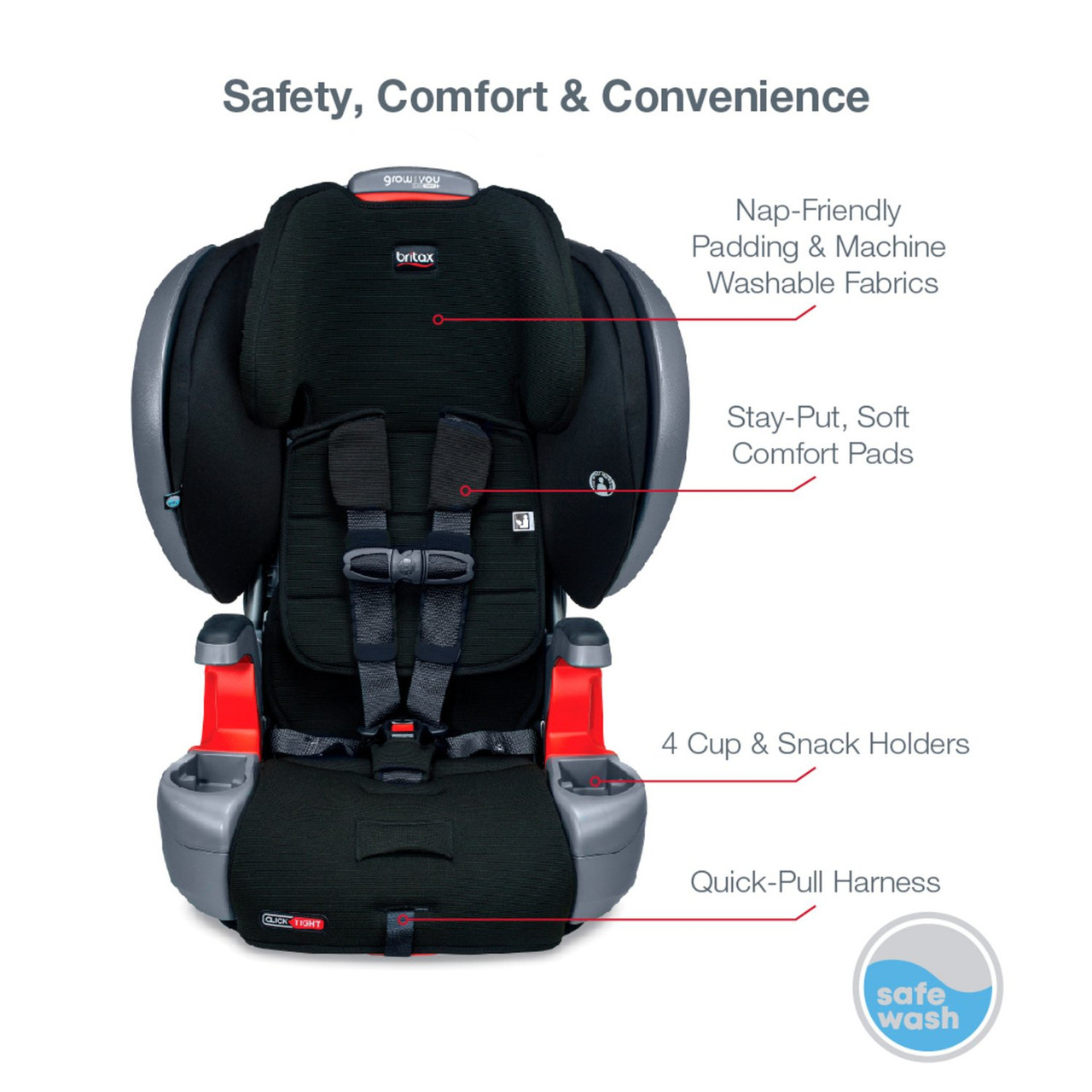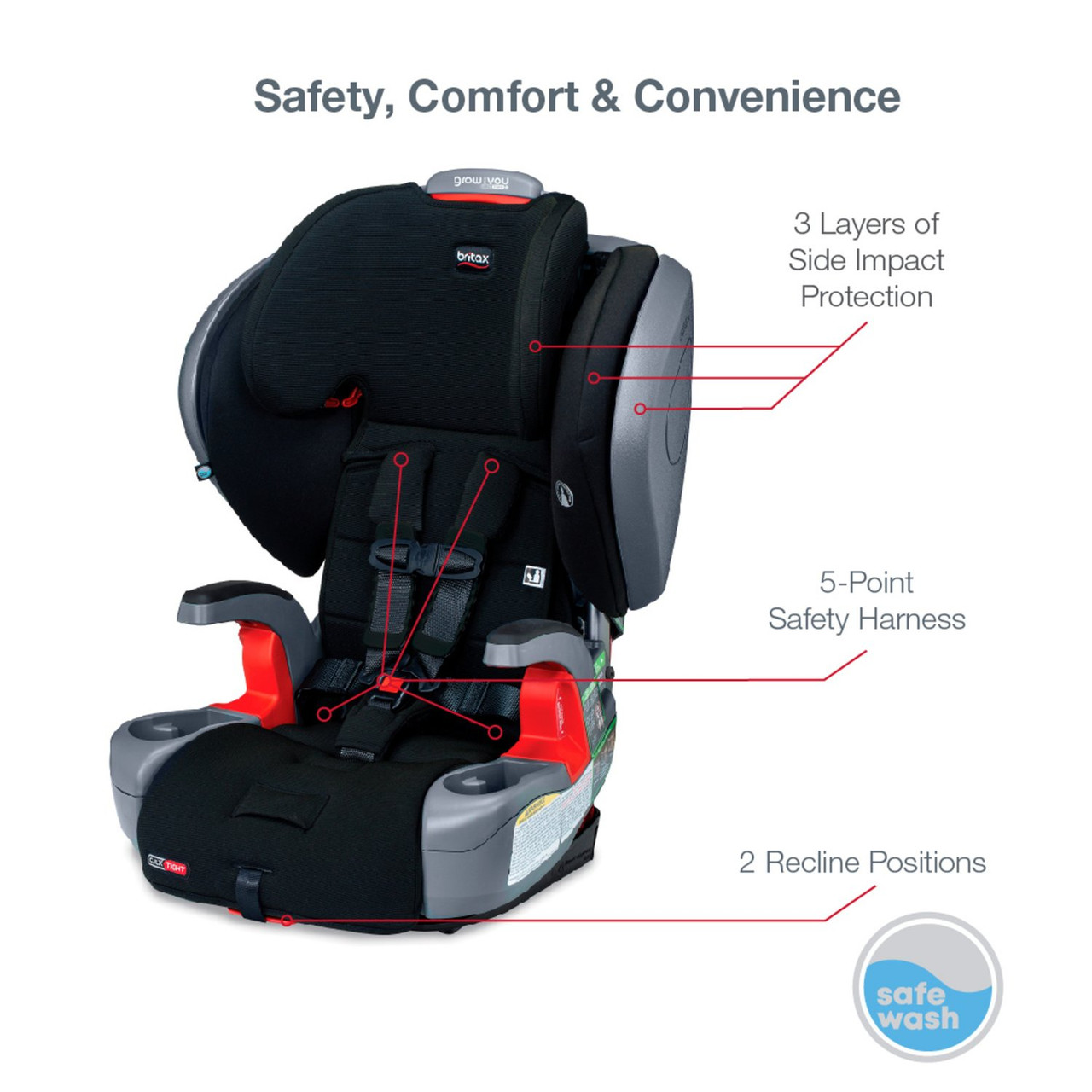 3 layers of side impact protection surround the head, neck and torso. A steel frame and crumple zone help absorb crash energy. And, the patented v-shaped tether helps slow forward movement, so you can travel with peace of mind.