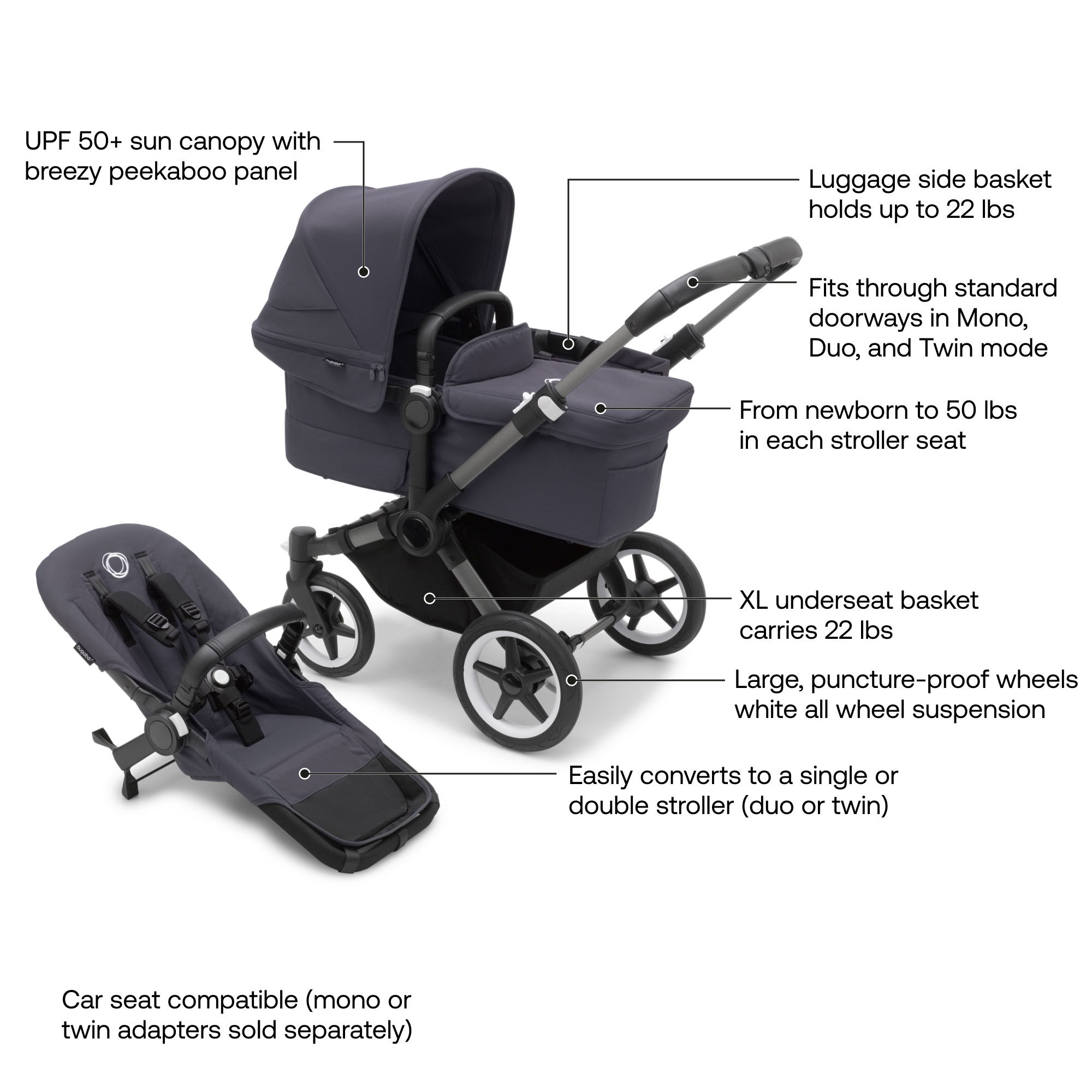 - • Easily converts to double stroller for two children with Duo extension sets