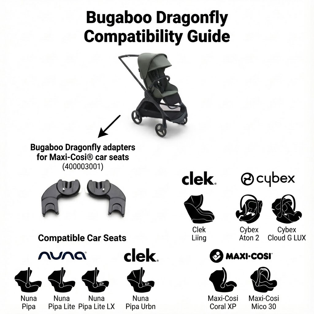 Move seamlessly from car to stroller with the Bugaboo Dragonfly car seat adapters. Compatible with Bugaboo Turtle Air by Nuna & other Maxi-Cosi® infant car seats.