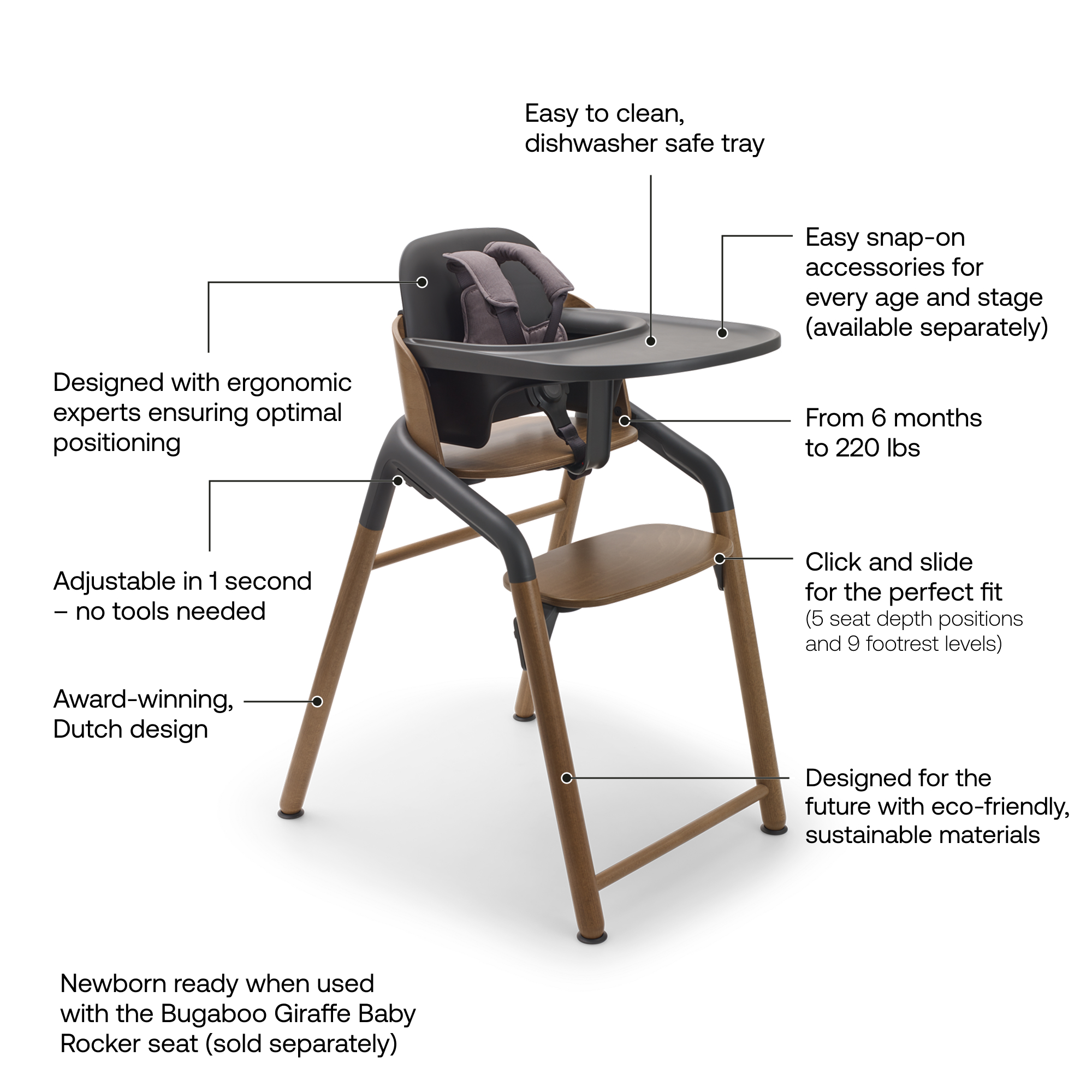 The chair designed for all ages and adjustable in one second. The Bugaboo Giraffe is lightweight, versatile, and built to last a lifetime.Key Features