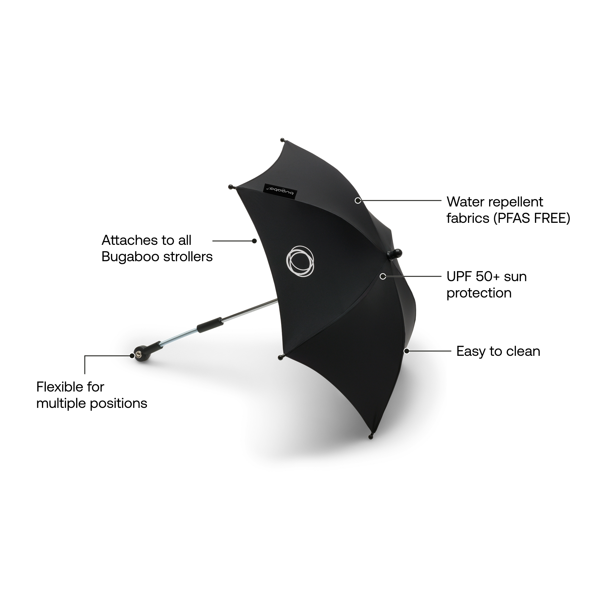 Shade your baby from the sun while adding a splash of color to your strolls. The Bugaboo parasol features UPF 50+ fabrics, and you can adjust it to face any way you like, so it doesn't matter where the sun is or where your adventures take you.