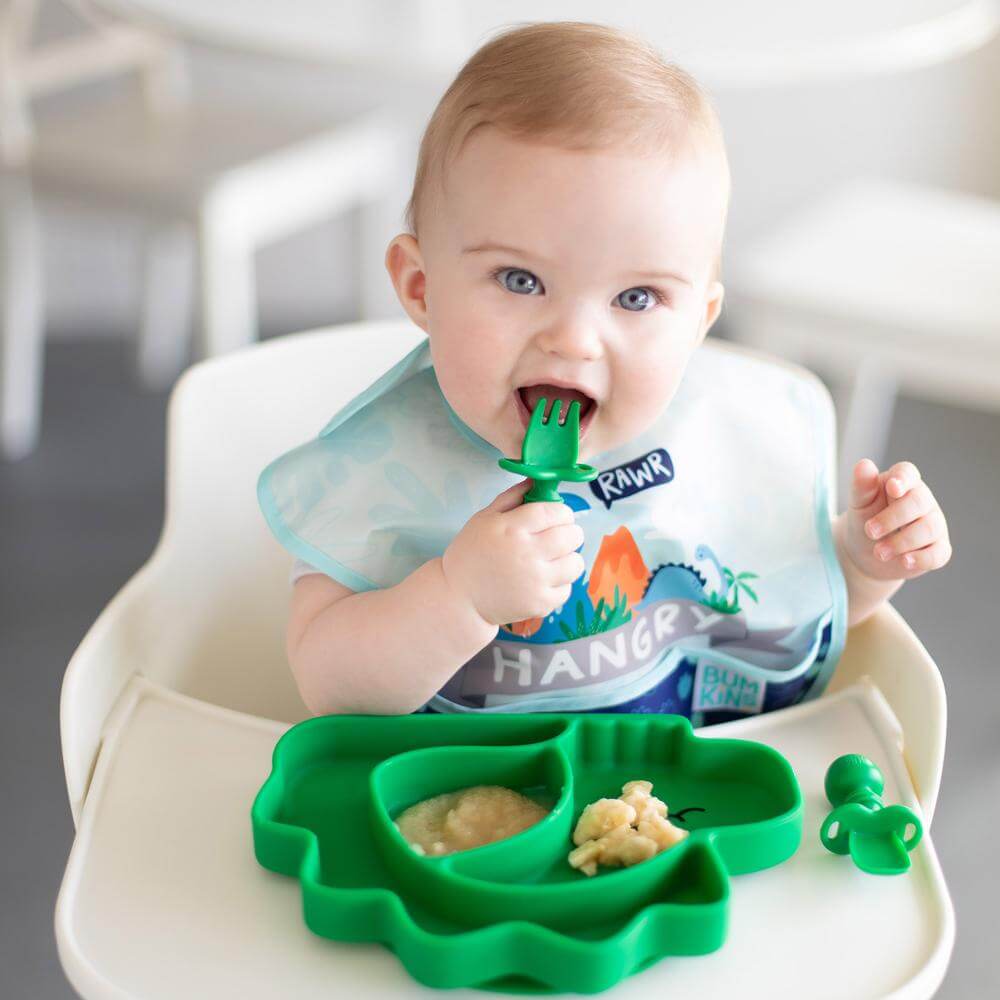 Our Dinosaur Silicone Grip Dish is perfect for little ones learning to self-feed. This divided plate is perfectly sized for toddler portions. A strong suction base ensures the dish stays put – even with the most aggressive toddler! Great for use on highchair trays or tables. Silicone can withstand low and high temperatures, easily transitioning from the refrigerator or freezer to the oven or microwave. Made with 100% food-safe silicone that’s durable, stain and bacteria resistant. Plus, its design is dinosaur inspired for your little one.
