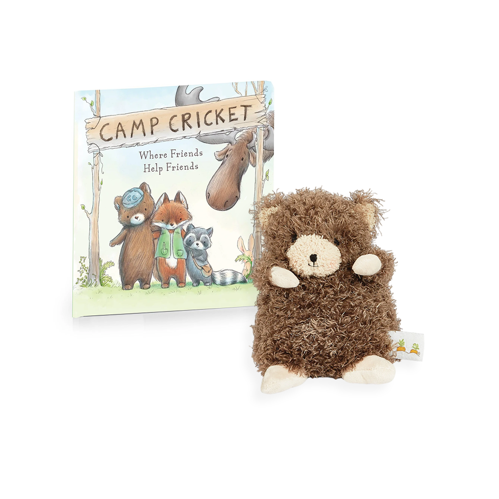 "Camp Cricket" Storybook - In the Camp Cricket Book join our forest friends as they learn that a helpful friend is the best friend of all, no matter their size. A charming Hareytale board book with beautiful illustrations featuring the woodland characters Bruce the Moose, Foxy the Fox, Roxy the Raccoon, Cubby the Bear, and Harey the Bunny Rabbit.
