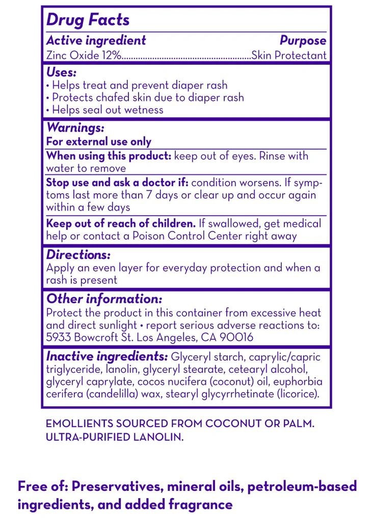 Vitamin-grade zinc oxide treats and prevents diaper rash while purified lanolin leaves a moisture barrier on the skin. Added coconut oil and licorice help soothe sore bottoms. Cloth-diaper safe.