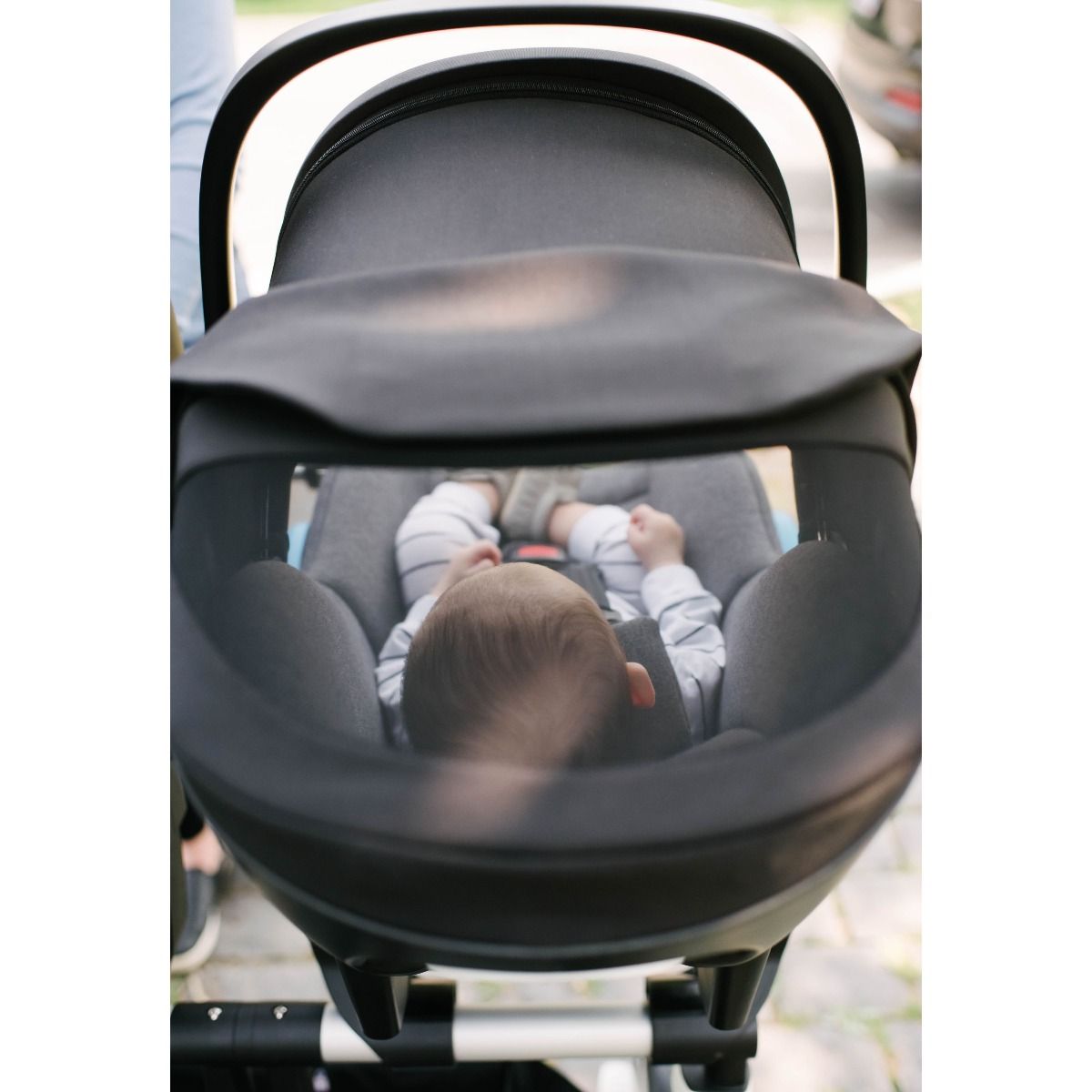The 3-position, UPF50+ adjustable sun canopy provides almost full coverage from the sun, with a mesh peekaboo window for airflow and visibility into the car seat.