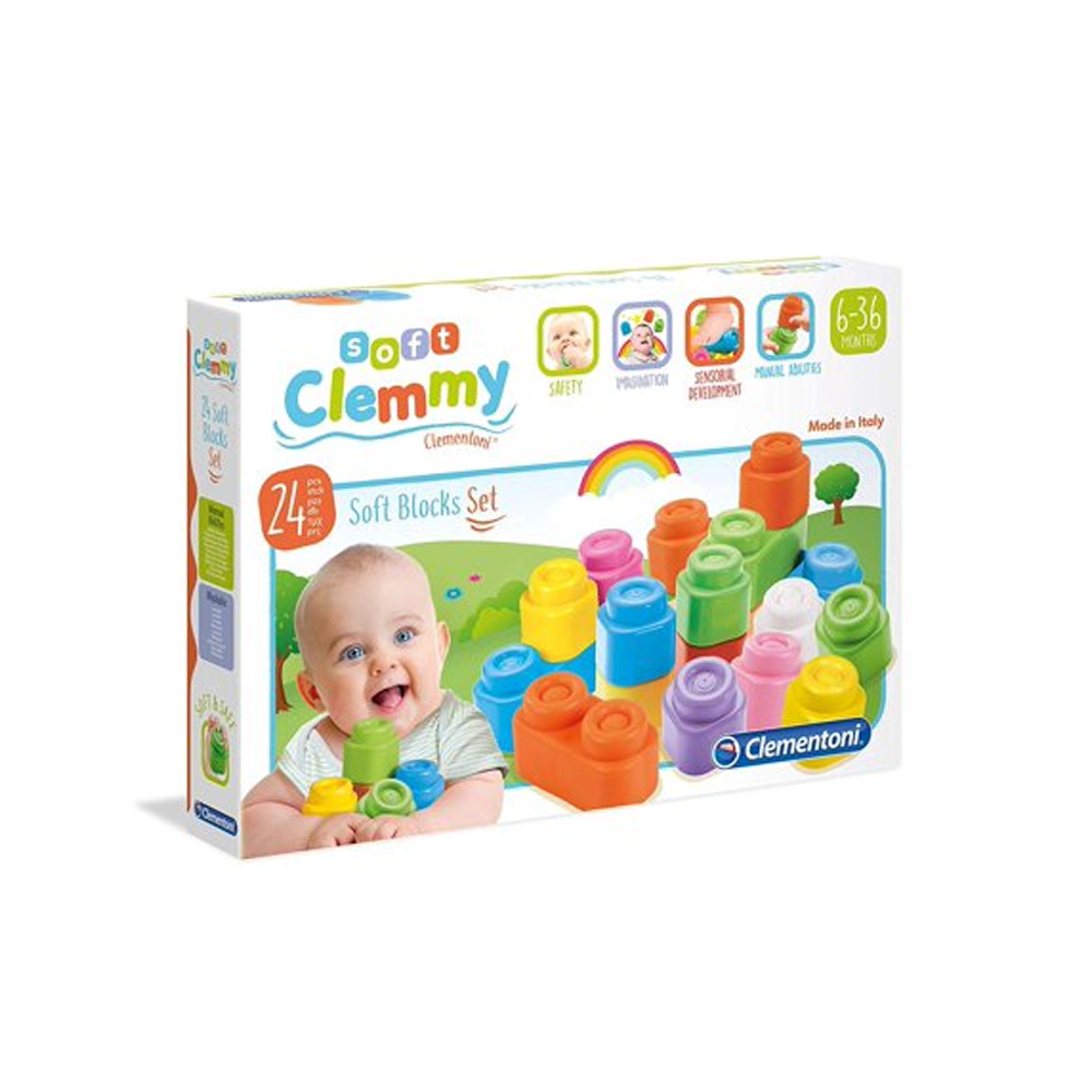 Contains 24 colorful clemmy bricks, designed to let children, aged 6-18 months, play safely. Soft and lightly perfumed they areperfect for the sense development and for stimulating sight, touch, attention and also observation capacity. Made with non-toxic and washable material, they are easy to grab and stack up and they support child fantasy and creativity. All baby clemmy bricks are made in italy.