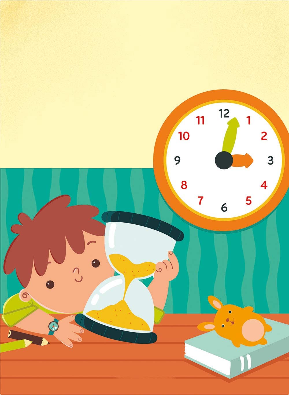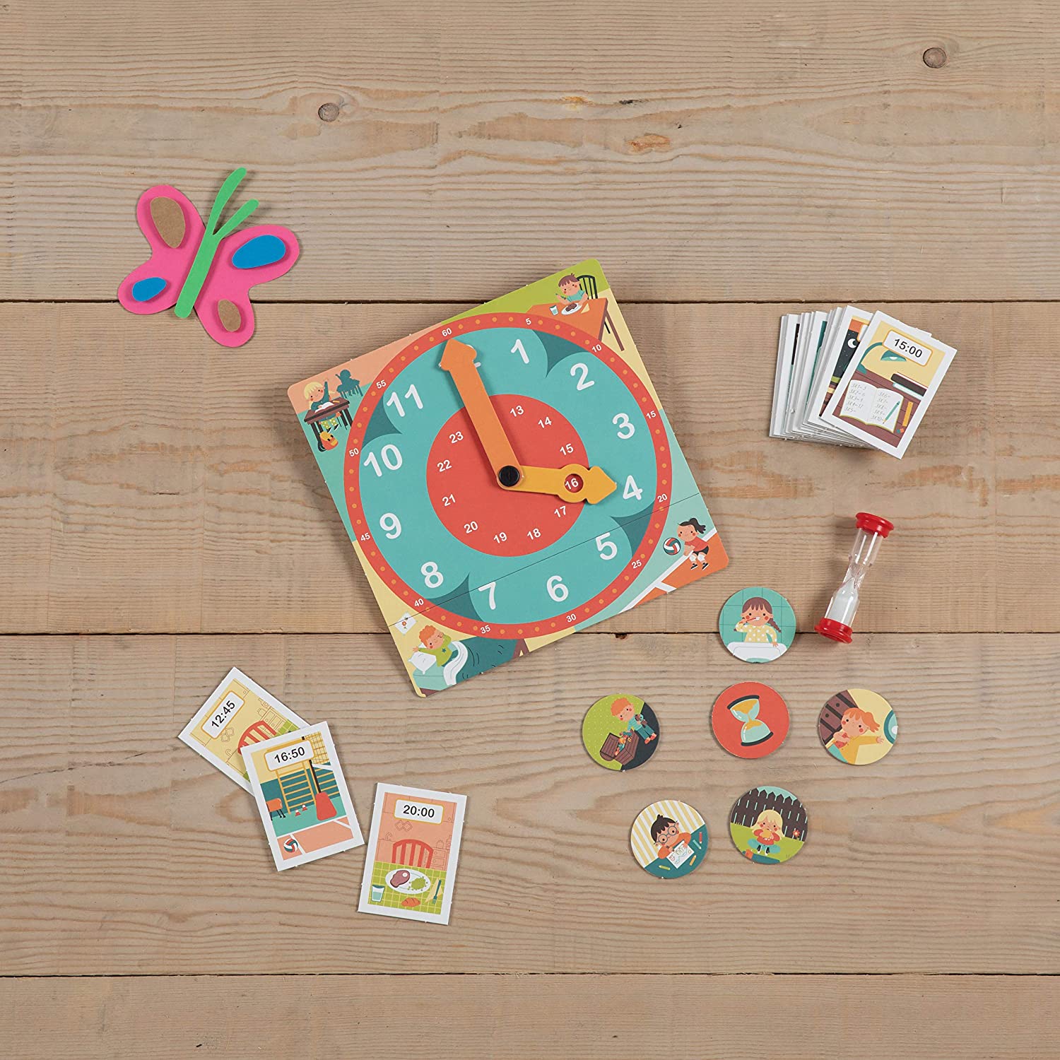 A game with a large watch, many picture cards and an hourglass to understand the concept of time and learn to tell the time in a simple and fun way with knowledge.