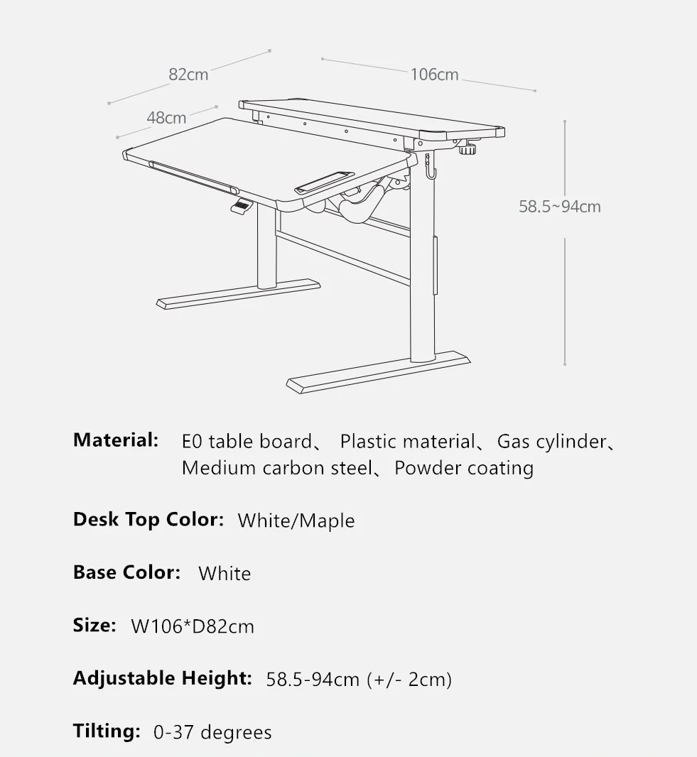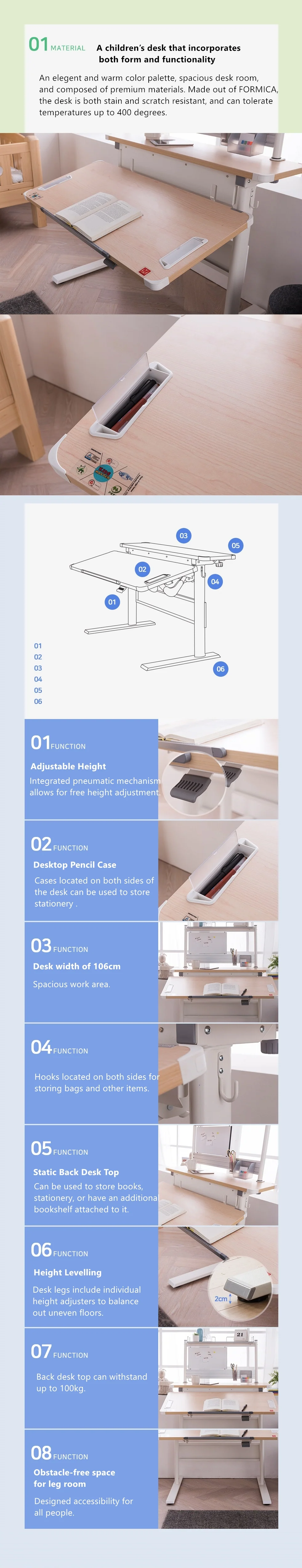 The children's desk features an elegant design with premium FORMICA materials, offering a spacious and functional workspace. It includes adjustable height, desktop pencil cases, ample width, hooks for storage, a static back desk top for items or an additional shelf, height leveling for uneven floors, and an obstacle-free legroom space for universal