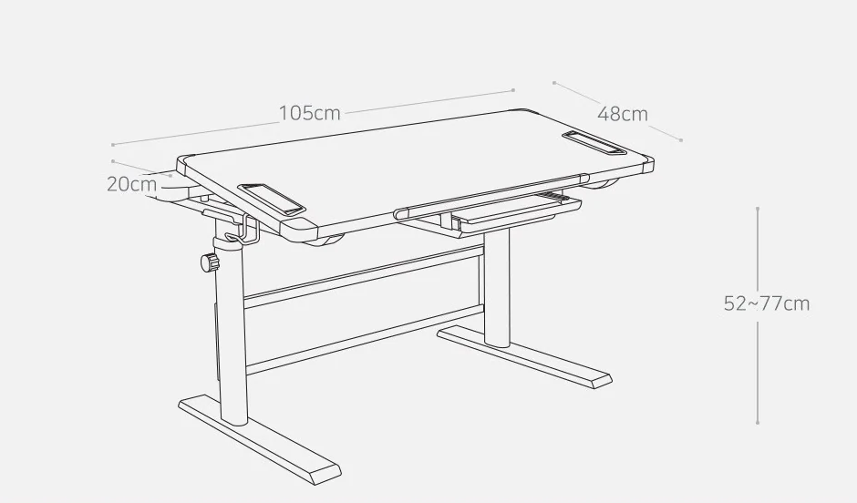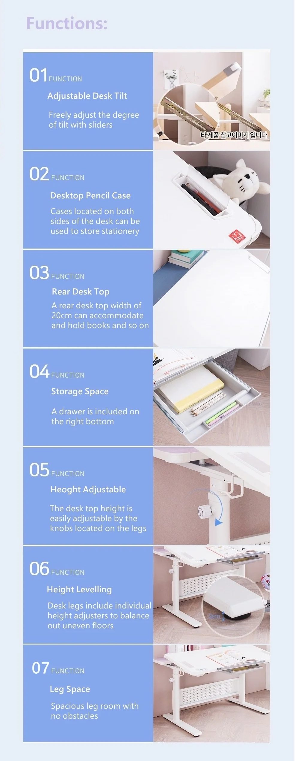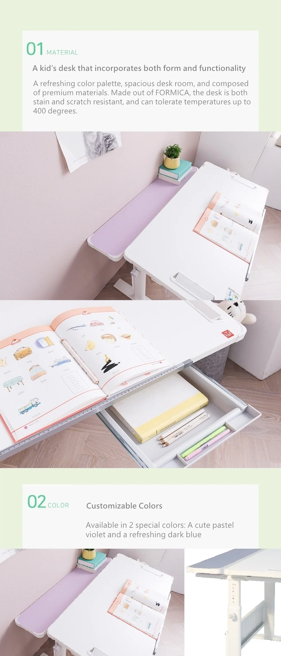 The Comf-pro K1050 Ergonomic Desk is a kids' desk designed for both style and functionality. Made of premium, stain, and scratch-resistant Formica, it offers customizable colors (pastel violet and dark blue). Features include adjustable tilt, desktop pencil cases, rear desk top for books, storage drawer, height adjustability, leveling knobs, and spacious leg room.