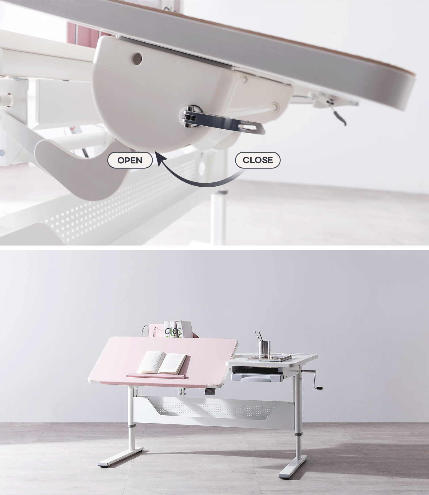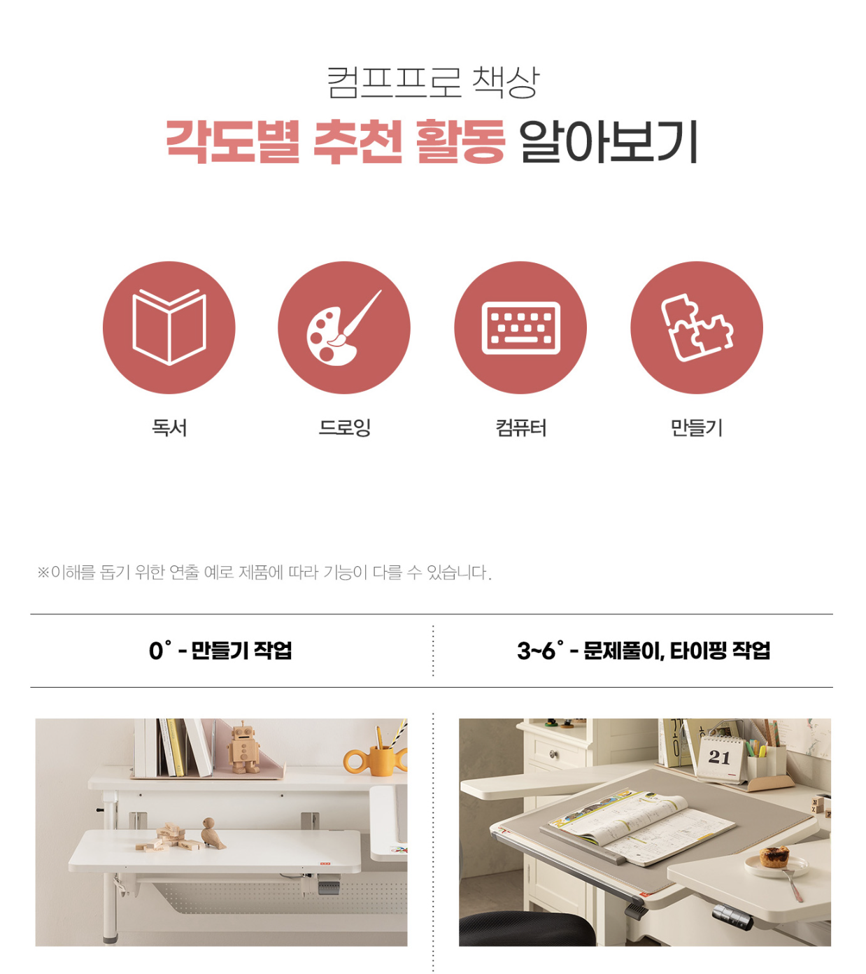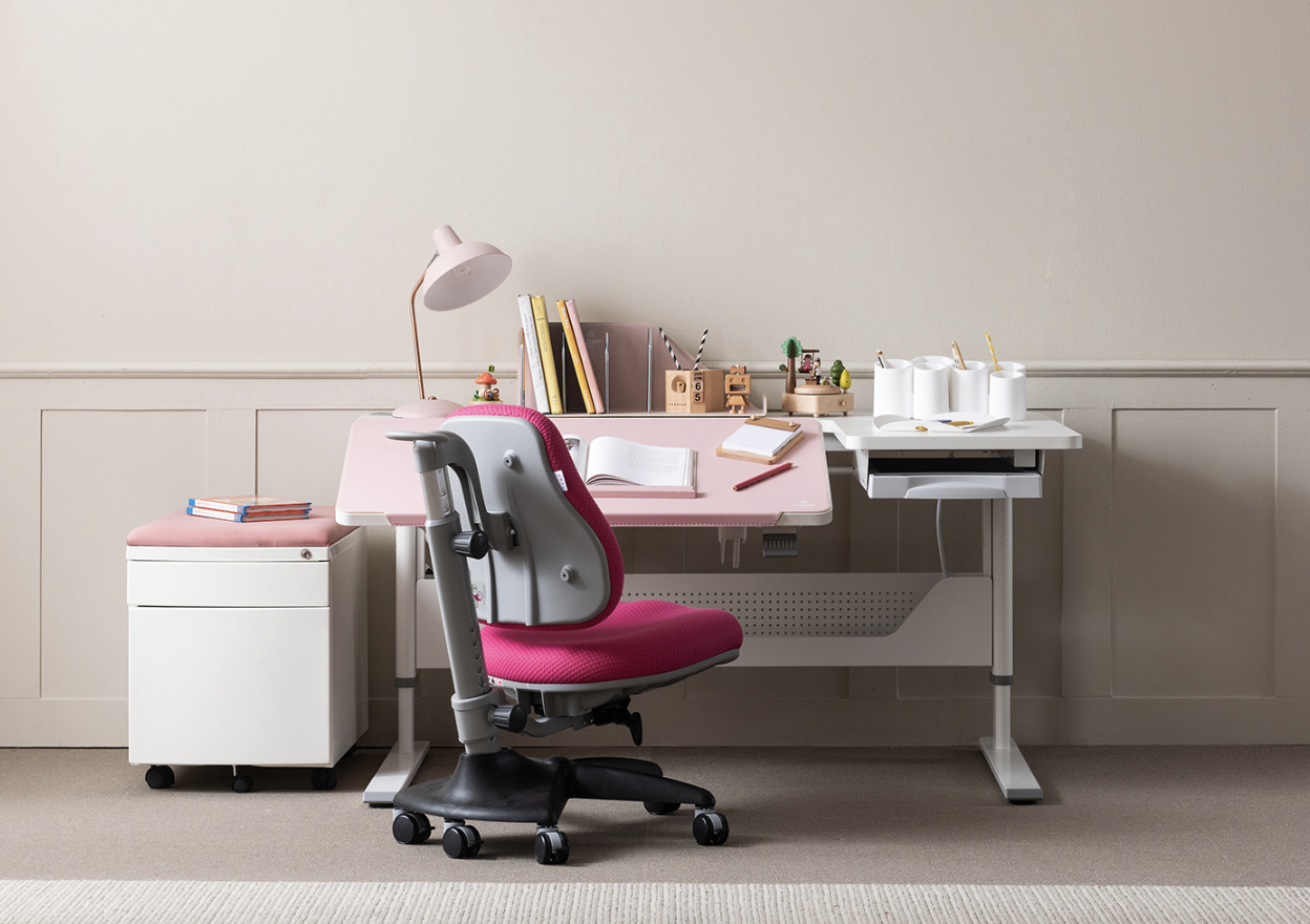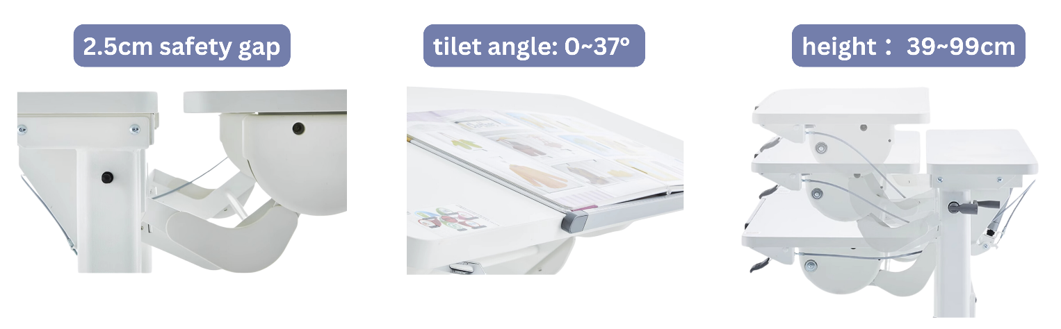 The Comf-pro Dual Adjustable Desk, with double up and down function, isometric optimization, and various tilt adjustments, ensures good posture and blood circulation, recommended for various activities like reading, working, and assembly, solving parents' troubles with its compact design.