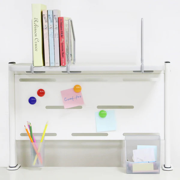 A compact and space-saving movable hanging stationery case with a metal whiteboard for note-posting, featuring a fixed bookend and a clip designed for desktop boards with a thickness below 4 cm.