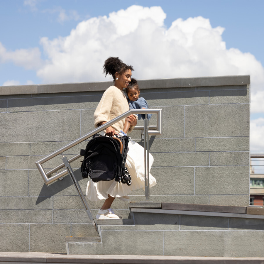 A one-handed compact fold and an integrated carry handle make the Hummingbird Stroller easy and portable for everyday errands and travel