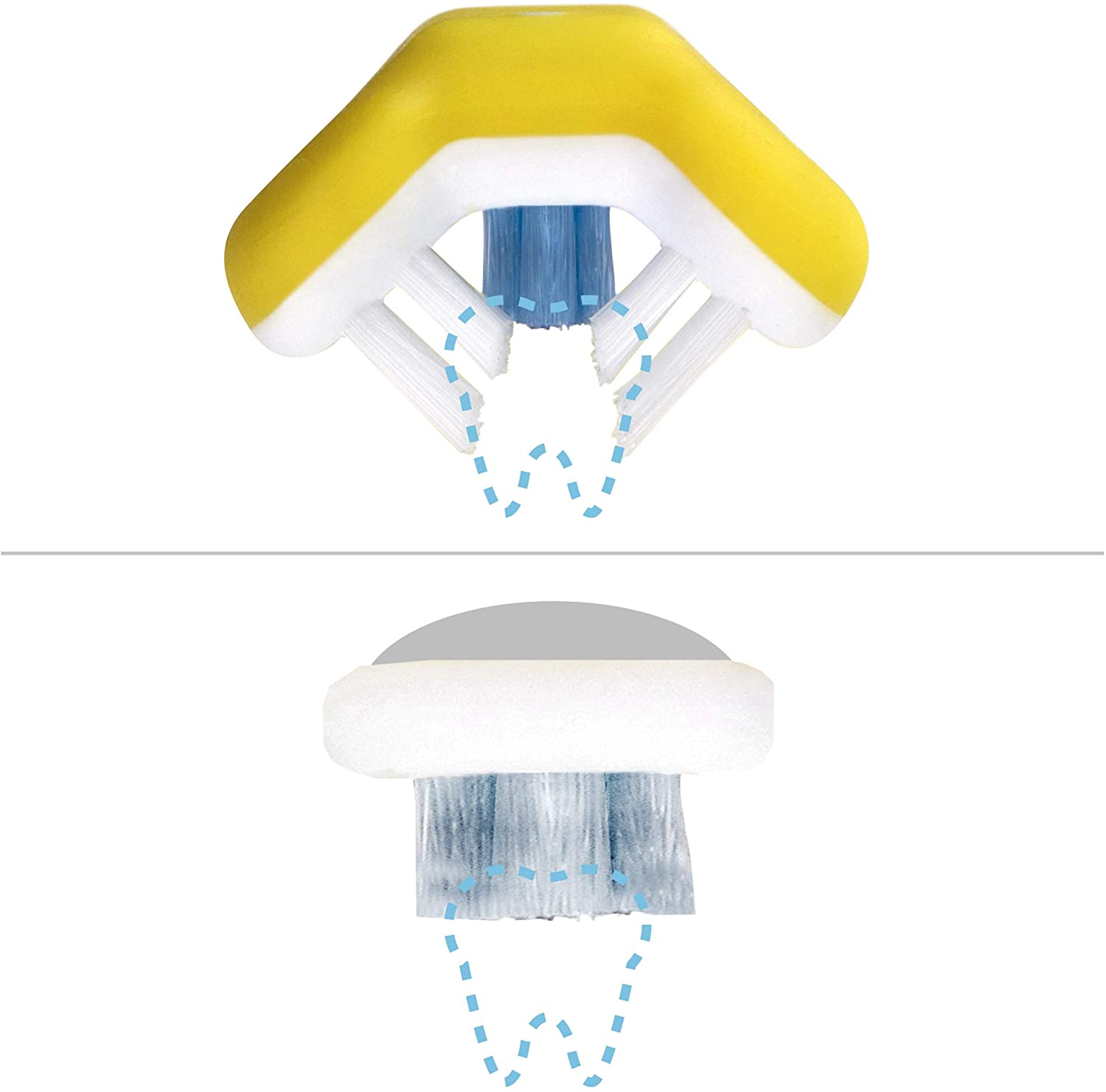 Fridababy SmileFrida Toddler Toothbrush features a unique triple-brush head design that attacks plaque fast by hugging teeth and cleaning all sides at once. Specially designed for little ones, the bristles will bend, not break, if they bite down.