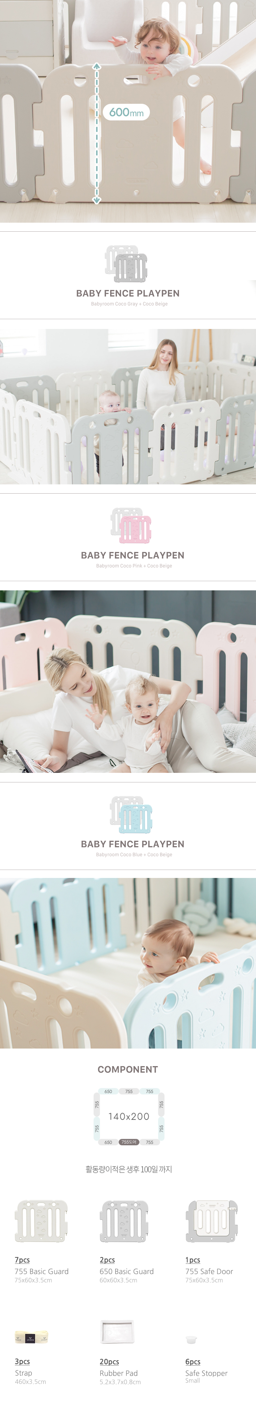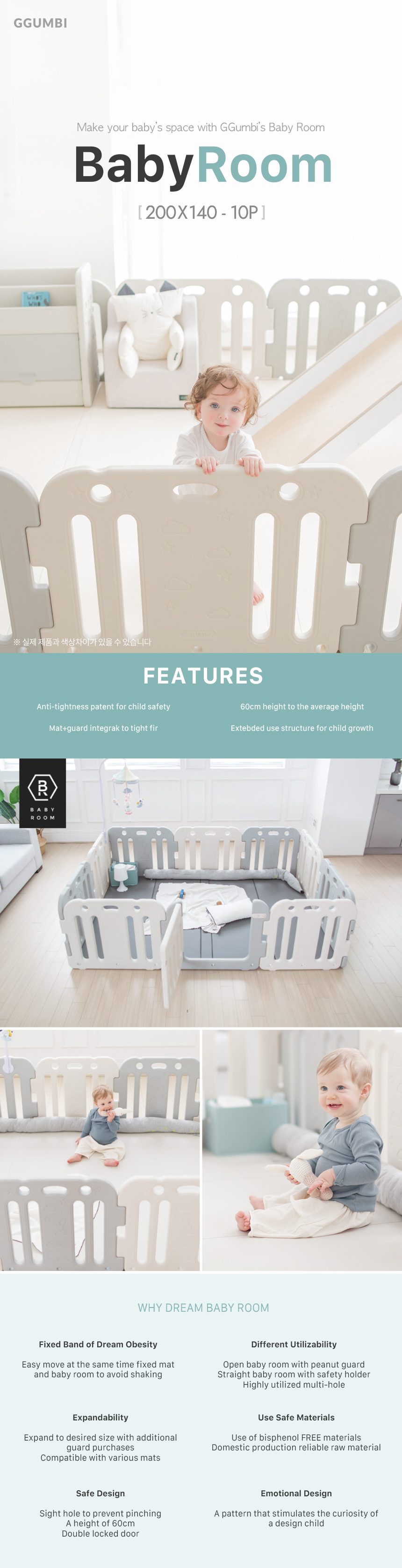 Ggumbi playpens are made with non-toxic, BPA-free materials. All raw materials are certified and imported from Korea, ensuring high safety and quality standards. The panels are made of PE (Polyethylene) and the connectors are PP (Polypropylene) — both materials are widely used in baby products for being safe, durable, and free from harmful substances.