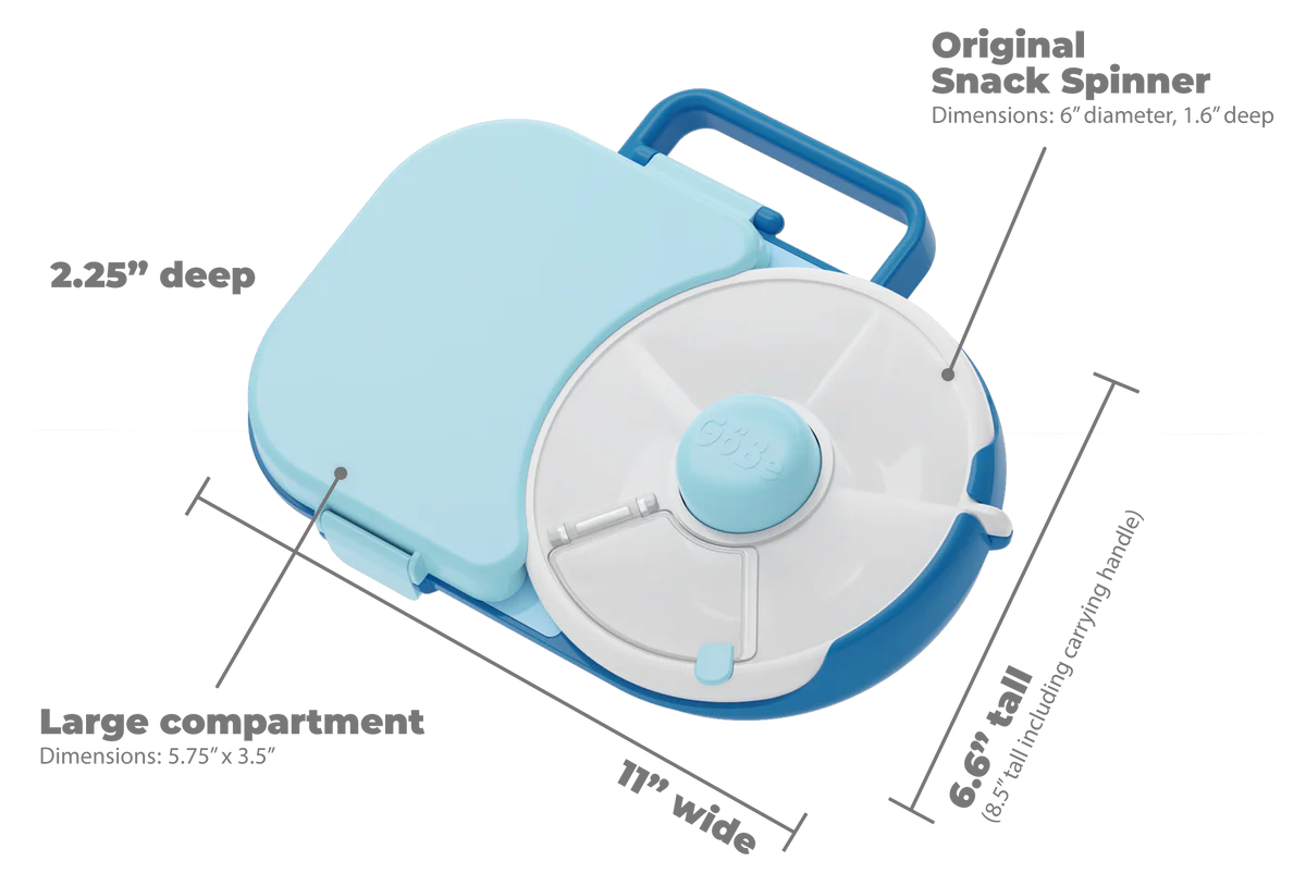 Our newest design is also one of our most customizable-so let’s give a happy hello to the GoBe Lunchbox! No matter where busy days, outings, or adventures take you and your little one, the GoBe Lunchbox’s innovative design will make mealtime a walk in the park (literally!). Complete with a carrying handle, bento compartment (that can hold at least a whole sandwich), and a secure holding area for one of our Original Snack Spinners, the Lunchbox keeps everything together in a beautifully convenient package. Not to mention, the delightfully customizable design of the Lunchbox means you can mix and match colors with any Original Snack Spinners you own (or buy)!