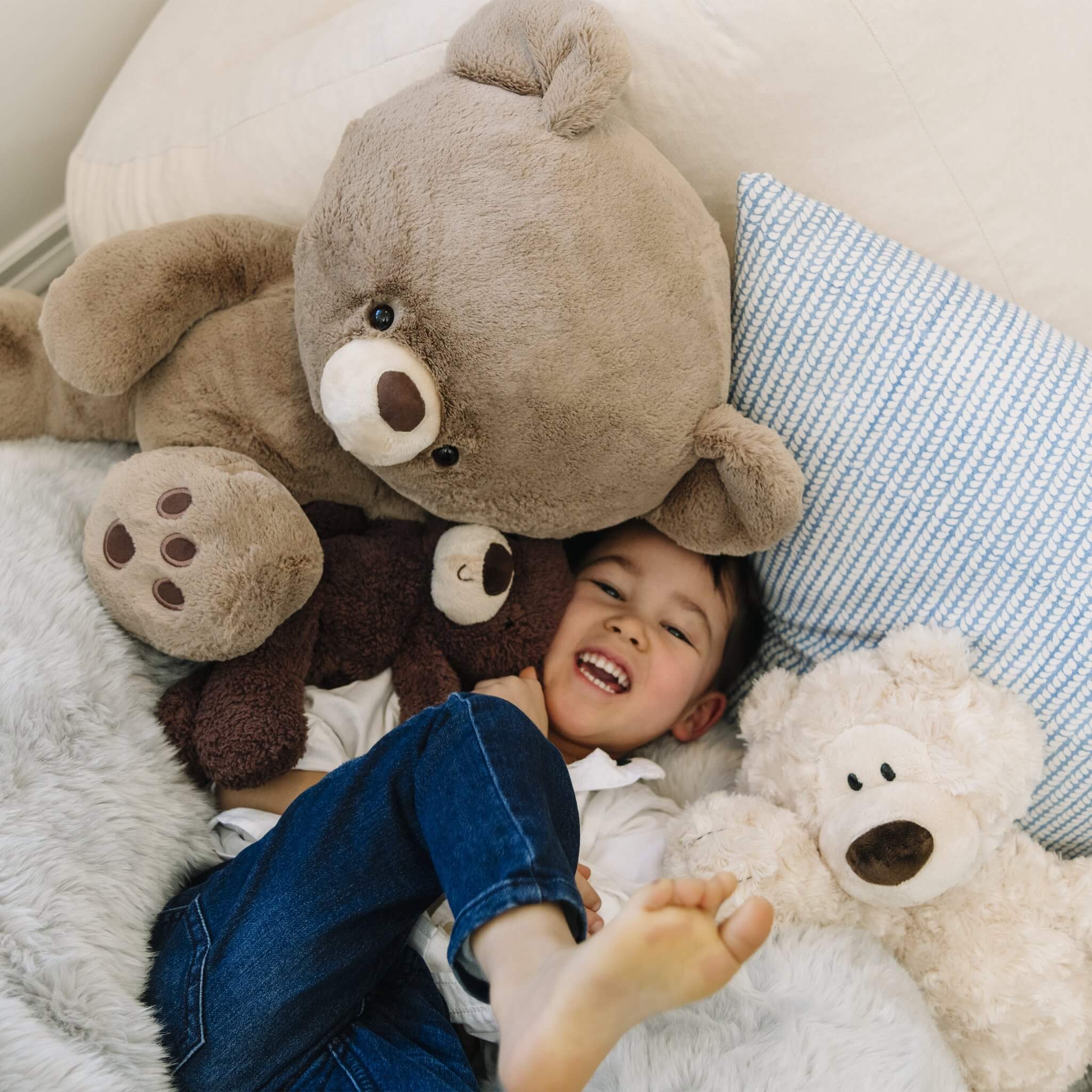 Kai is a sweet dreamer with their head in the clouds, but they always come down-to-earth to spend time with friends! This taupe teddy bear has super-soft plush on a modern style with adorably oversized head, embroided paw pads, and beige muzzle. Surface-washable for easy cleaning. 58.42 cm (23 inches). 1+ years.