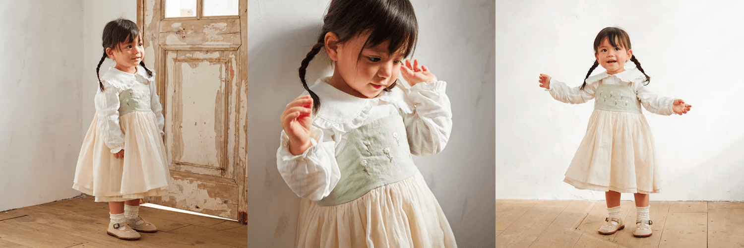 A blouse with a large frilled collar. Made out of organic cotton fabric with a check weave pattern. Frills around the collar and flower-shaped buttons make it a perfect stable for sping and summer. It is an elegant piece that can be worn for small ceremonies and special events.