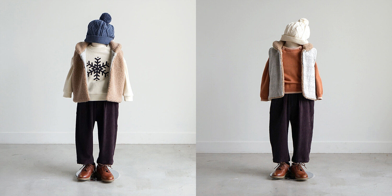 A reversible vest that combines a sheep-like boa fabric and a jacquard fabric.