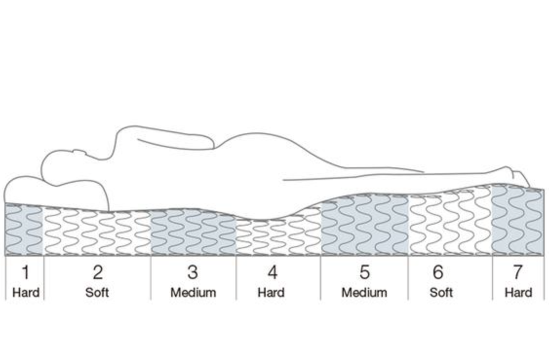 (head, shoulders, back, hips, legs, and feet) to provide the optimal level of hardness for a good night's sleep.