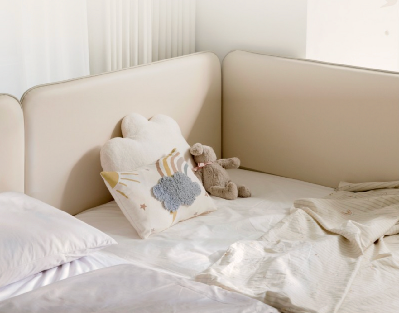 Its soft, rounded silhouette and neutral beige tone blend seamlessly with the Cusino series, maintaining the brand’s signature minimalist aesthetic. Made with durable, eco-friendly materials, the Cusino Bed Guard ensures safety and stability while enhancing the overall harmony of your bedroom.