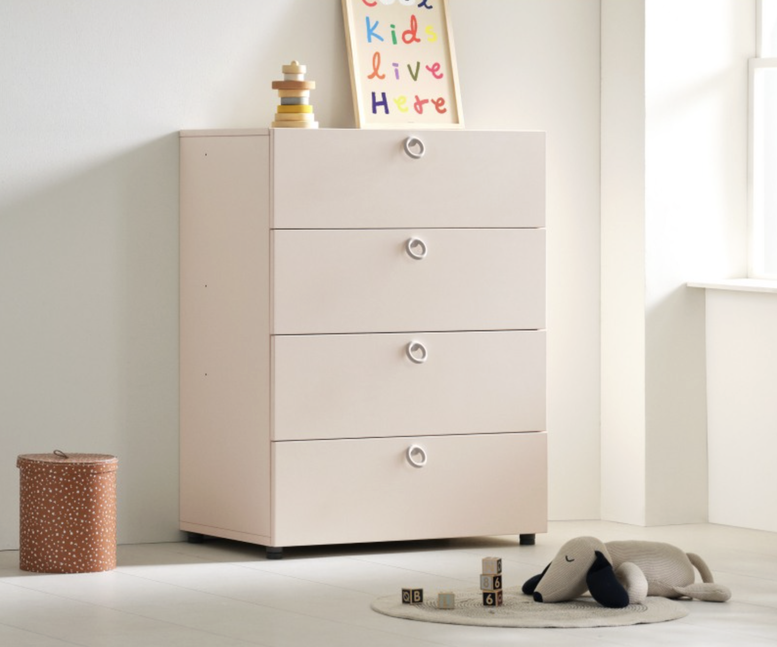 The Iloom Eddi Kids 4-Story Drawer 800W (Ivory) combines practical storage with a clean, modern design ideal for children’s rooms. Its compact yet spacious drawers make organizing clothes, toys, and essentials simple and accessible for kids.