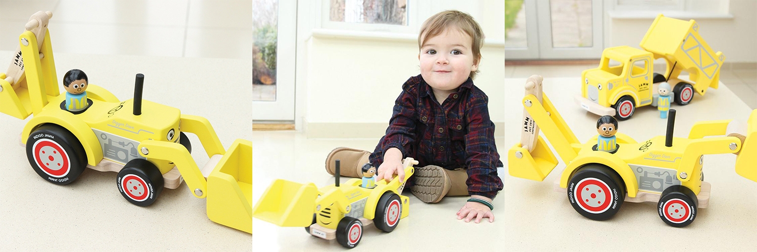 A push-along digger with removable driver. With movable scoop and front bucket loader. This fun traditional wooden toy helps to promote fine motor skills and hand-eye coordination. Ideal for imaginative play and a great addition to Toy truck. This wooden toy is made of sustainable rubber wood.