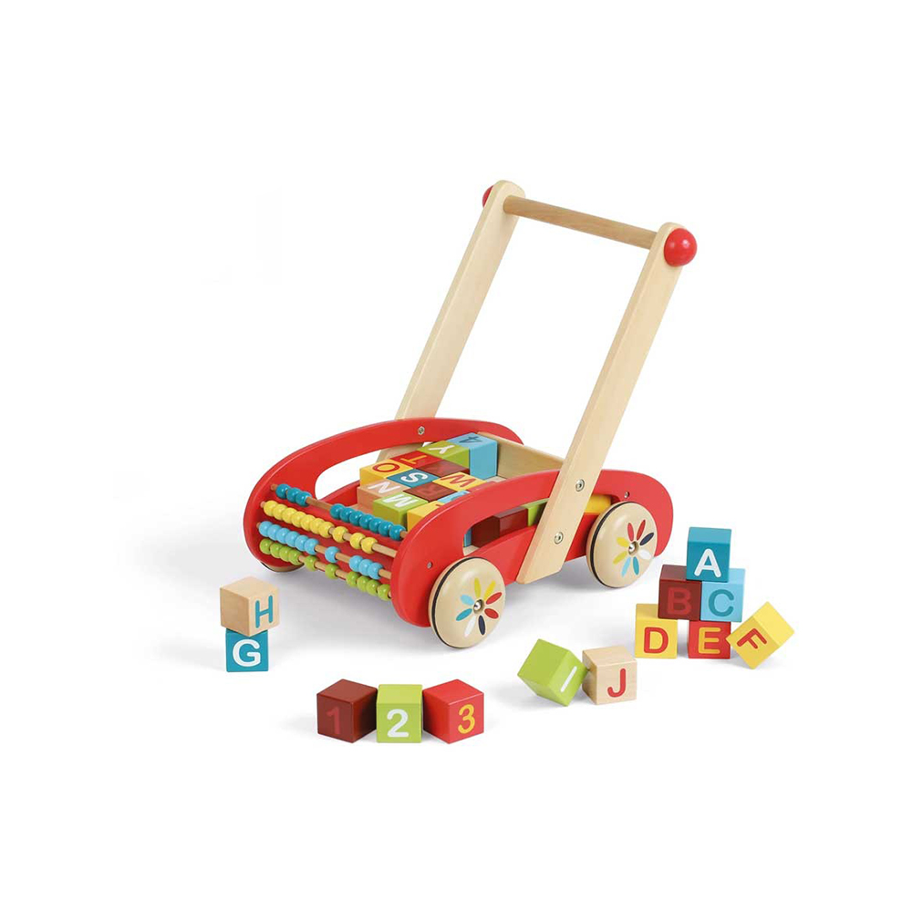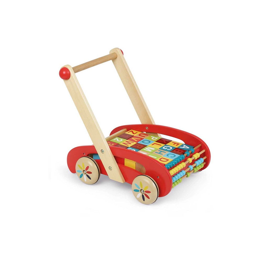 Your little one will love walking about with all of the amazing, detailed features on this classically styled buggy baby walker. Product Description The Janod Original ABC Buggy Baby Walker proves that you can't beat solid wood craftsmanship for fun baby toys. Very colorful, this walker comes with a set of 20 wooden alphabet blocks, a working abacus in the front, wooden pinwheel designed wheels with lined rubber grips, solid red wooden handle, and snazzy teal side planks. Your child will love learning to walk with this great toy from Janod.
