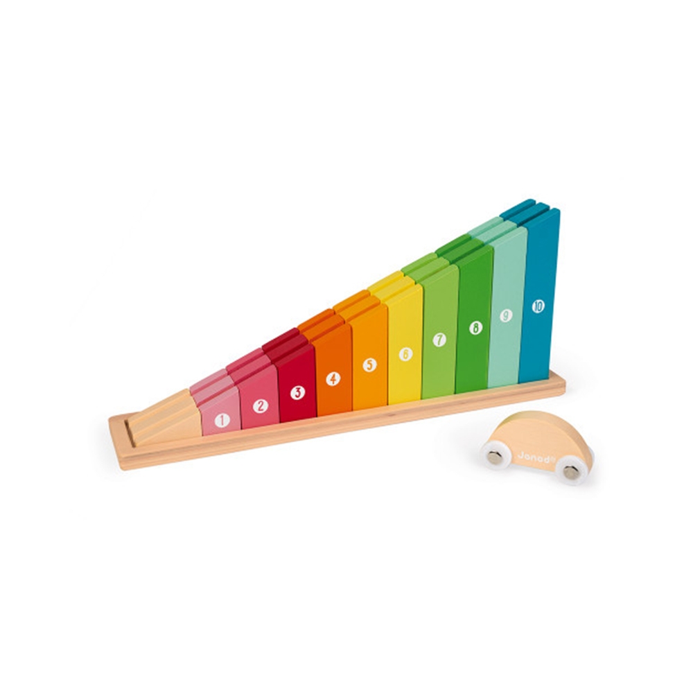 This beautiful wooden construction game is made of 10 blocks to be replaced in ascending order on their base to form a slope. Each block is numbered from 1 to 10 to learn the order of magnitude. Once the slope is finished, the little car can roll it down to check that there is no error, and then park in the garage under the last blocks! This construction game will help your child learn numbers and sizes.Product info
