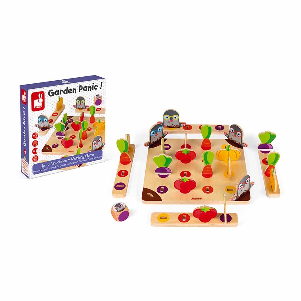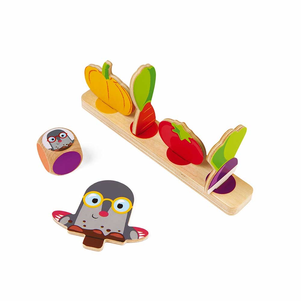 Be the first to fill your basket by trying to avoid moles! The goal of the game is to fill one's basket with 4 different vegetables before one's opponents, but beware of the mole who may get in to make its burrow! This game will help children learn colours and develop their observatory skills. Contains 1 board, 4 stands, 20 pawns and 1 die. Rules of the game are in French, English, German, German, Spanish and Italian. Range reminder card included inside the box.  Dimensions 24 x 22.5 x 1 cm (9.4 x 8.9 x 0.4") Material(s) Wood Box type Lovely illustrated box to easily store the game Number of players 2 to 4