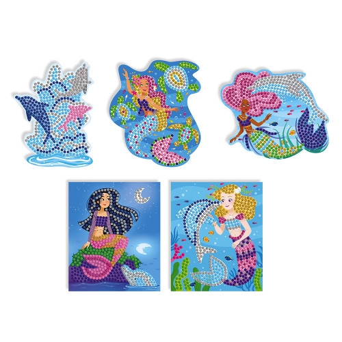 This creative kit allows you to create beautiful colorful pictures on the theme of dolphins and mermaids. To do so, simply stick the different mosaics on each card. This kit contains: 5 boards to decorate, 2400 foam mosaics of 10 different colors, 5 adhesive fasteners and 1 booklet with instructions and models.