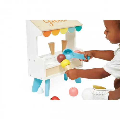 Would you rather a vanilla or strawberry ice cream cone? Try all the flavours with this wooden ice cream stand! Ideal for children aged 3 years and up: this refreshing pretend play toy is great for gathering around delicious ice cream cones. Everything foodies could ever need: 3 cones, 6 scoops of different-coloured ice cream, in addition to fruit and whipped cream to further fuel the imagination! A total of 14 magnetic accessories are included for practical reasons: so nothing will fall off the cone. Even smarter: the spoon provided is also magnetic so that our little sellers can easily scoop up the ice cream! Once the customer is satisfied, the spoon can be hung on the side of the stall. Besides the 6 slots for displaying ready-to-go ice creams, the stand also boasts a storage compartment at the back. With this wooden stall, little ones can pretend to be ice cream sellers and imitate the adults, which is sure to go down a treat with the whole family! This mini stand can easily be placed on a table and encourages little ones to share: there’s bound to be something for everyone! This food-related pretend play toy also stimulates little ones’ imaginations: what if the strawberry ice cream actually tasted like bubble gum? Children will also need to carefully stack the elements and be creative, to sell the most attractive combinations. All the accessories are provided with the stand and everything is made of FSC® wood.