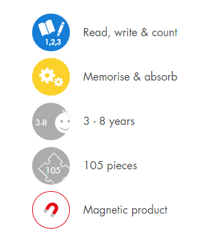 Gender:Mixed Accessories:105 letters + 26 illustrated magnets Material:Cardboard Dimensions:19 x 4 x 26 cm |