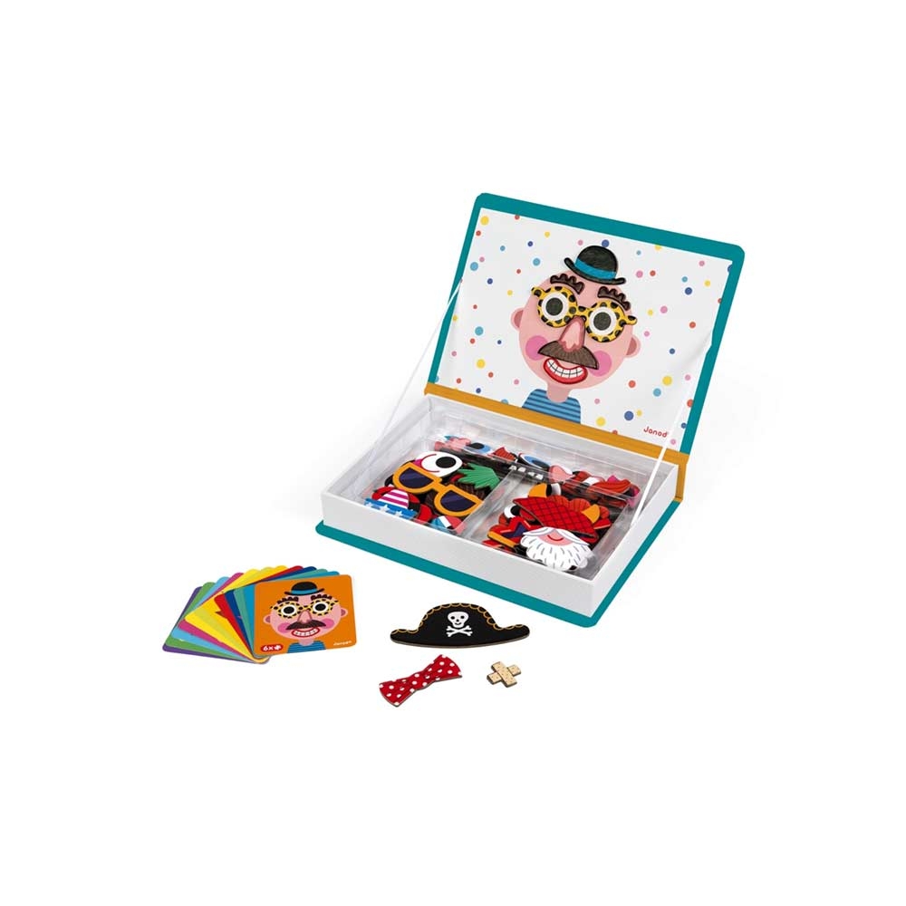 With Janod's Magnetibook Crazy Face, never wonder how to dress up crazy faces again. Designed in France, this handy book-shaped box is great for travel and includes everything you'll need to try all kinds of different faces - 67 magnetic pieces with 12 different crazy faces. Simply put up the card that contains the face you'd like to match and find the pieces in the box that make up the look . Or you can explore and see what fun and crazy expressions you can make one your own. Your Magnetibook comes in a great box disguised as a book that, once the cover is opened, creates the perfect dressing stage. Store and sort all your Magnetibook pieces in the different compartments so you're always ready to create.