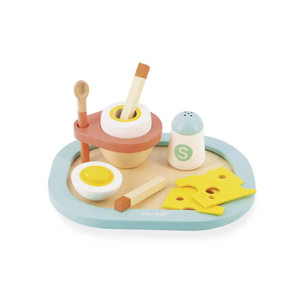 Eggs, what a treat! Especially when they are boiled eggs with soldiers! Here is a pretty egg-themed dining set for children from 3 years old who will have fun reproducing the gestures of family meals: perfect for the imagination and fine motor skills! In this beautiful wooden kit with soft colours, you will find all the essentials for a delicious meal: an egg that opens and an egg cup, two soldiers to dip in the egg, two slices of cheese made of felt, a spoon that can be stored on the egg cup, some salt and of course a nice tray to present it all! All the wooden elements of this imitation game are FSC® certified (wood from sustainably managed forests) and the paint is water-based.Product Details