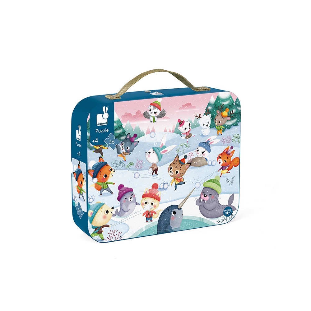 With this cardboard puzzle, your child will have fun watching the animals do a snowball fight, while developing their memory and dexterity. In its pretty suitcase, this puzzle will be easy to transport thanks to its fabric handle. A poster to be used as a template is include. Number of pieces: 36