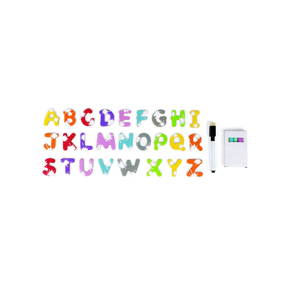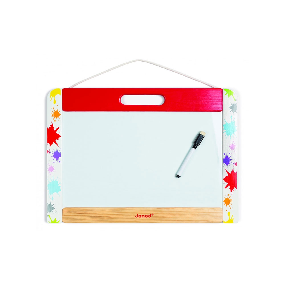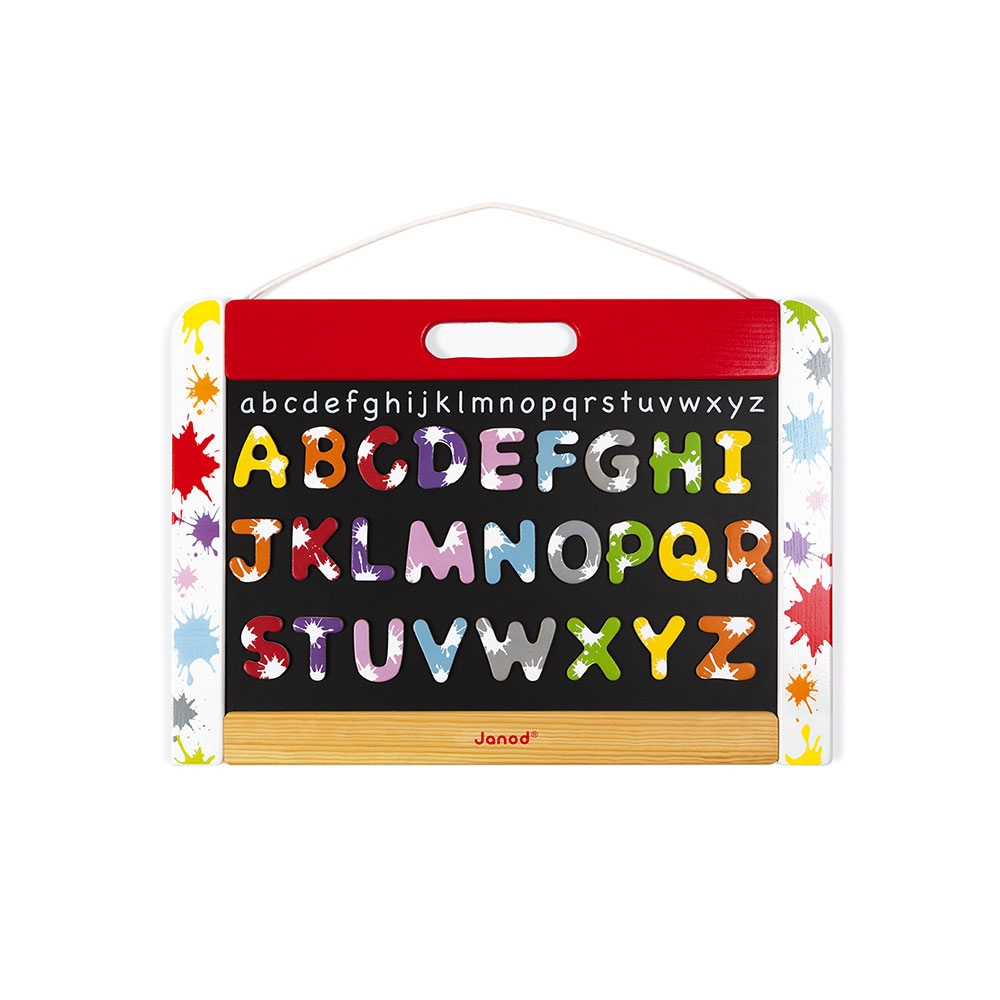 Magnetic writing board to hang on the wall. 1 writing board side to write with the chalk and 1 white side to write with the erasable marker. The board is magnetic on both sides, and includes 26 wooden letters, 1 box of 5 chalks and one marker with a brush cap. Wood : board frame (pinewood), black writing board (MDF), letters (plywood). Cotton string.Product info