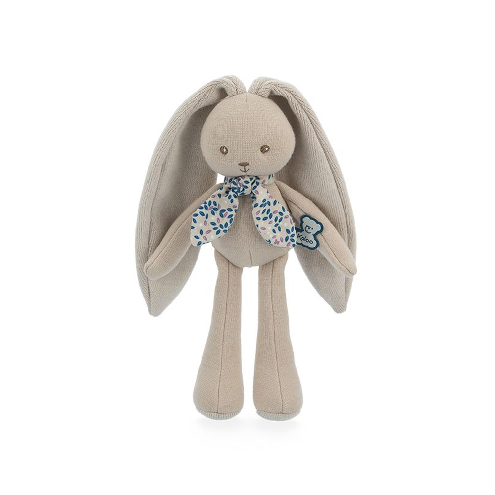 This cheerful little milk-colored rabbit has such long ears that you can hang it anywhere to keep it and never lose it. He can do anything with them: do headstands, go on the see-saw, cling to the clothesline, and even swing all the way to the moon. Its extra-long ears help the rabbit to wrap your baby in tender hugs and share sweet moments with them. It sports a small scarf, emblazoned with motifs, that gives it a very chic and refined touch. Made from an innovative and avant-garde jersey fabric, with a different feel between the ears and the body, baby will be able to develop his sense of touch. Its small size means it can be taken everywhere. Machine washable. This 25 cm rabbit is arranged in a pretty box that can be customised with a message in the allocated space under the cover.